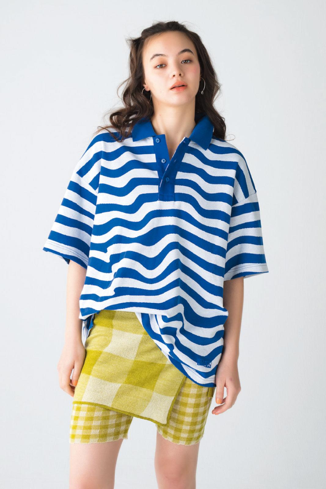 水面のように波打つボーダーが印象的。ボタンの留め方で表情が変わる一面も。トップス ¥45,100(ナパ バイ マーティンローズ/ディプトリクス TEL. 03-5464-8736) パンツセットスカート 参考価格¥63,300(ヤンヤン/リディア TEL. 03-3797-3200)