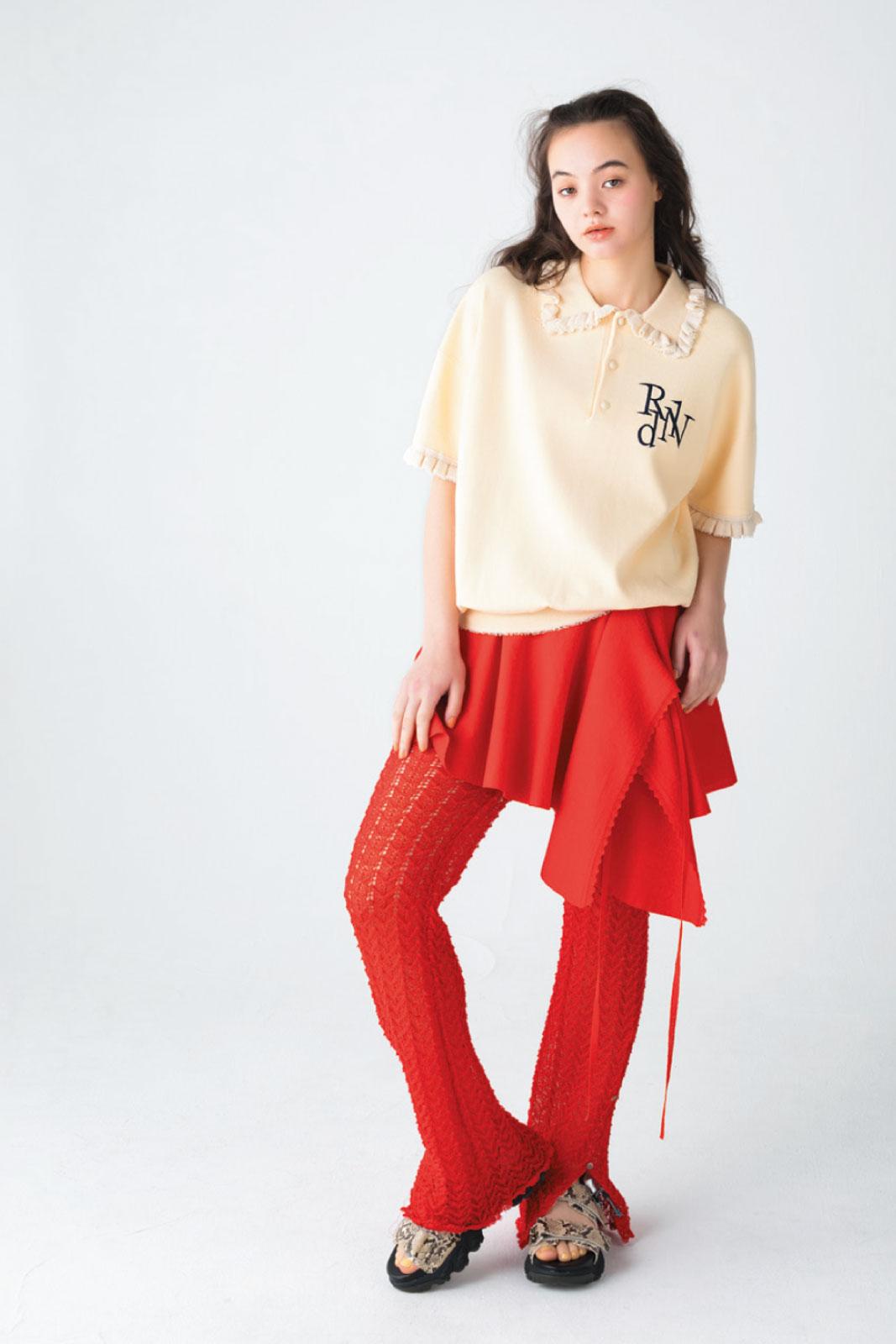 襟と袖口にフリルをあしらった華やかなポロニット。胸元のモノグラム刺繍がトラッドな気品を醸し出す。トップス ¥28,600(ロドリリオン/ネペンテス ウーマン トウキョウ) スカートコンビパンツ ¥27,500(プランクプロジェクト/プランクプロジェクト青山店 TEL. 03・6455・4550) サンダル ¥69,300(カラー)