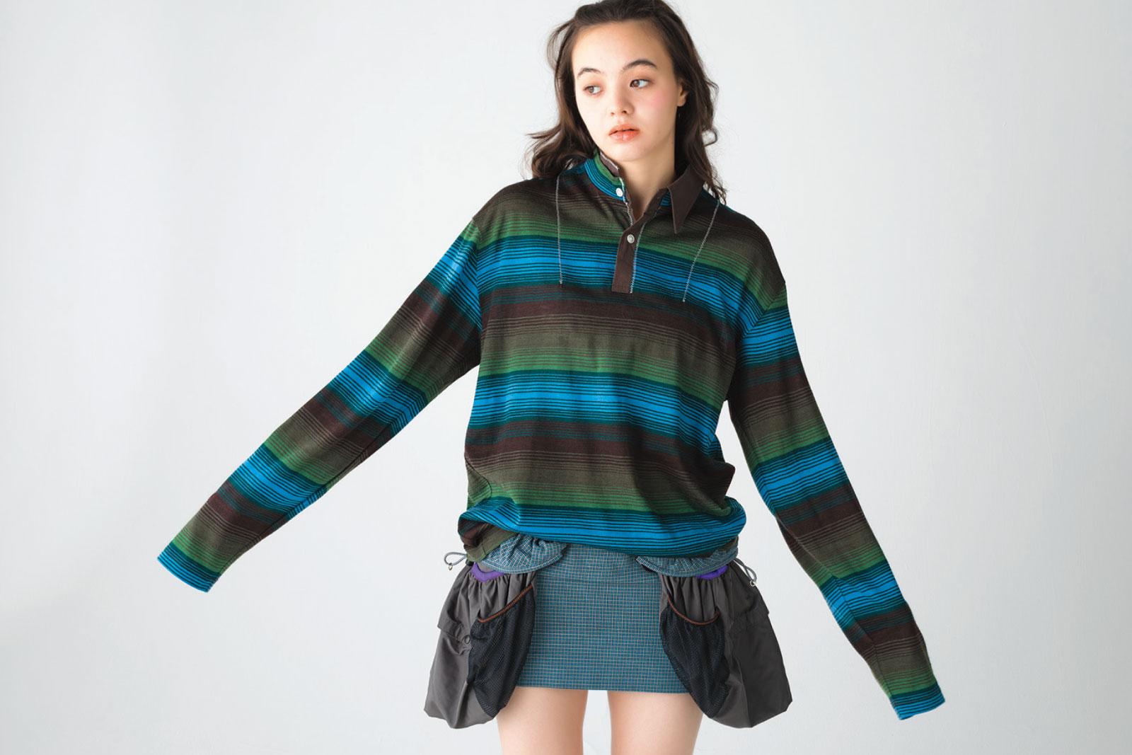 グリーンとブルーのラインは爽やかな春にぴったり。左右非対称な襟とグラデーションの個性派ボーダーで、唯一無二な存在感を楽しんで。トップス ¥60,500 スカート ¥159,500(共にカラー TEL. 03-6427-6226)