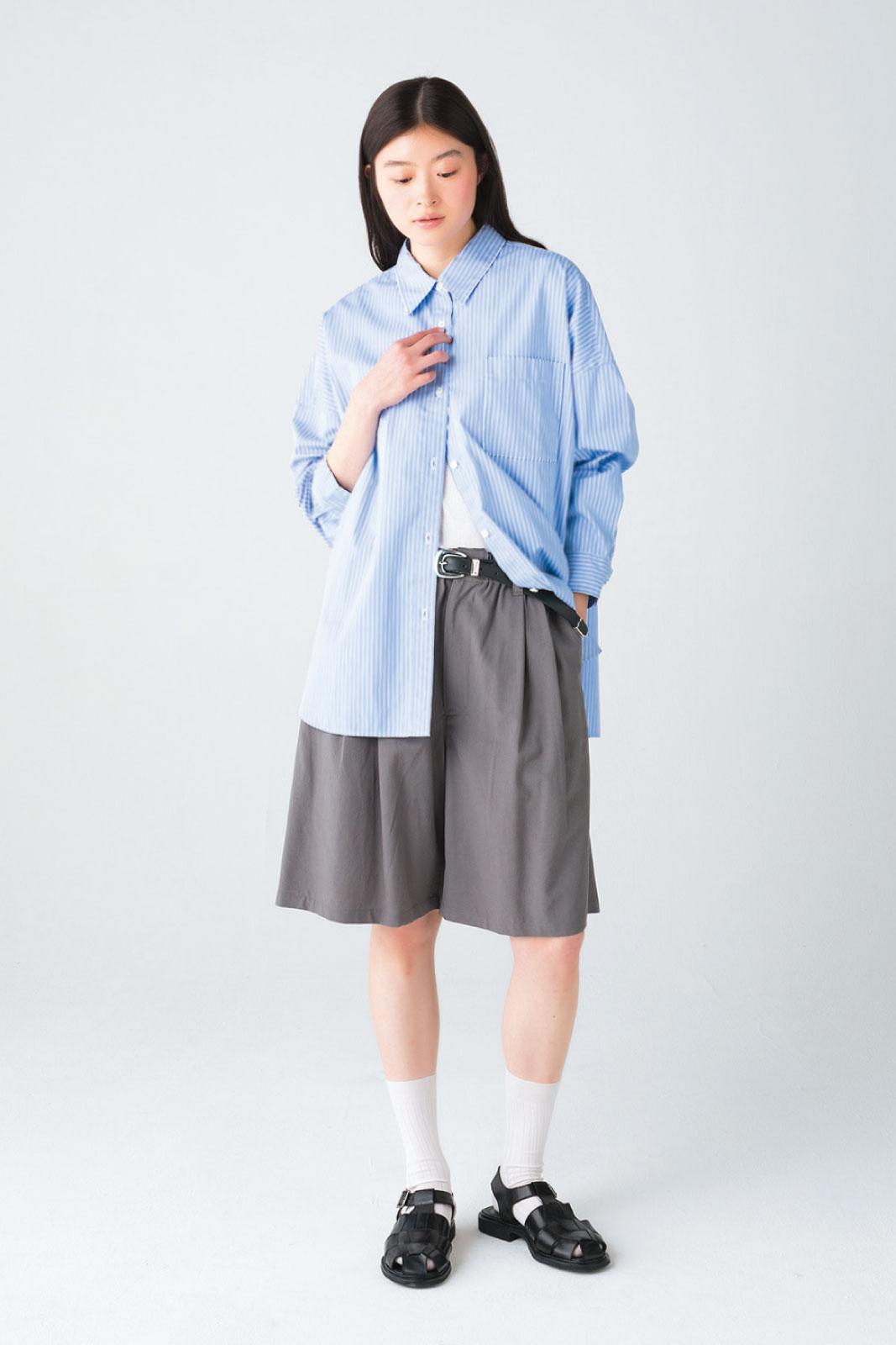 フロントのタックが生む立体感が、上品な印象を与える。ハーフパンツ ¥35,200(ヨーク/エンケル TEL. 03-6812-9897) シャツ ¥11,000(ジャーナル スタンダード レリューム/ジャーナル スタンダード レリューム ルミネ新宿店 TEL. 03-5909-4675) 中に着たカットソー ¥12,980(ビームス ジャパン/ビームス公式オンラインショップ) ベルト ¥28,600(ジェーン スミス/ジョン メイソン スミス ジェーン スミス ストア)