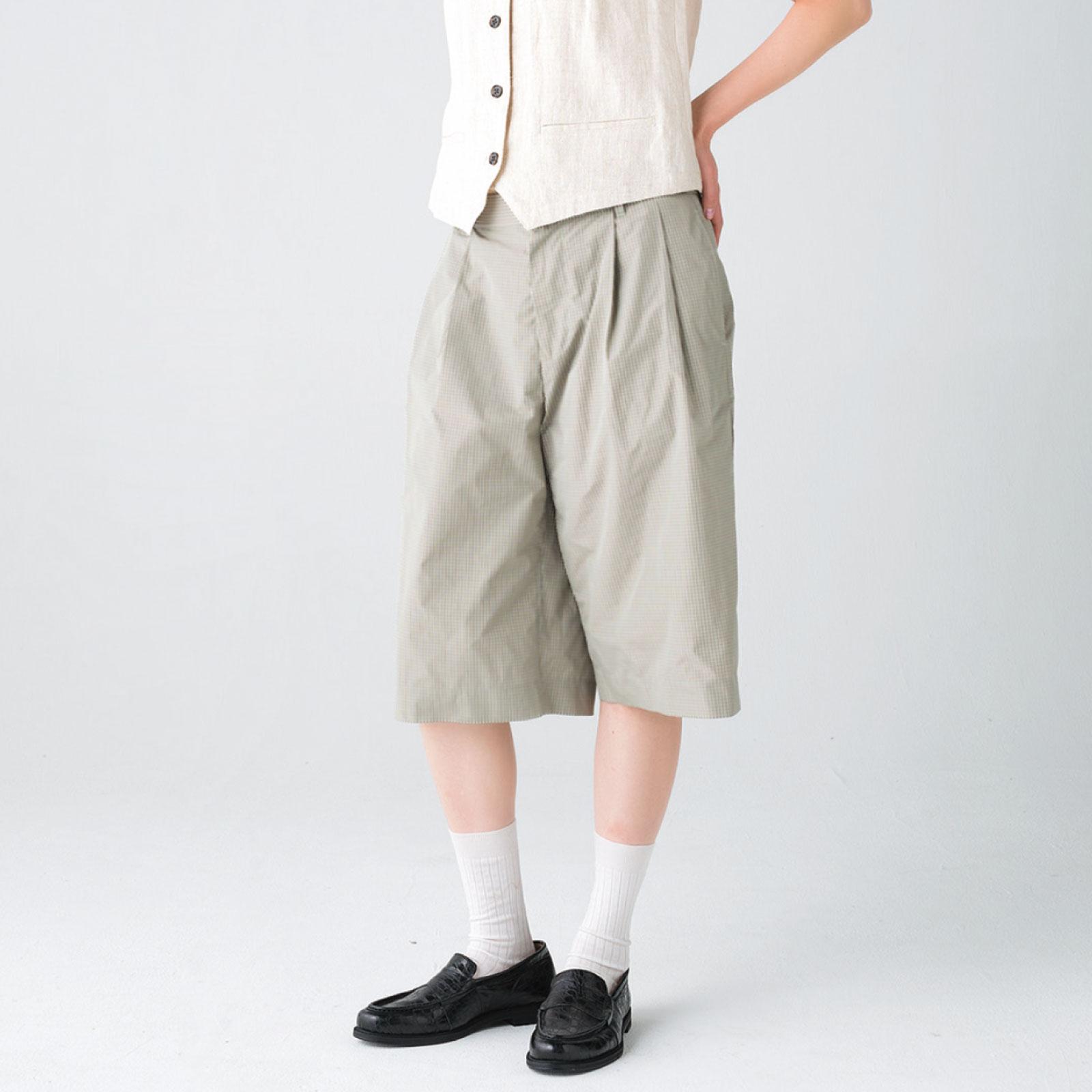 ベルトループやタックなど、スラックスのディテールを採用。ハーフパンツ ¥16,500(シティショップ TEL. 03・6696・2332) ローファー ¥31,900(シー ミー/シティショップ) ベスト ¥28,600(RHC/RHC ロンハーマン)