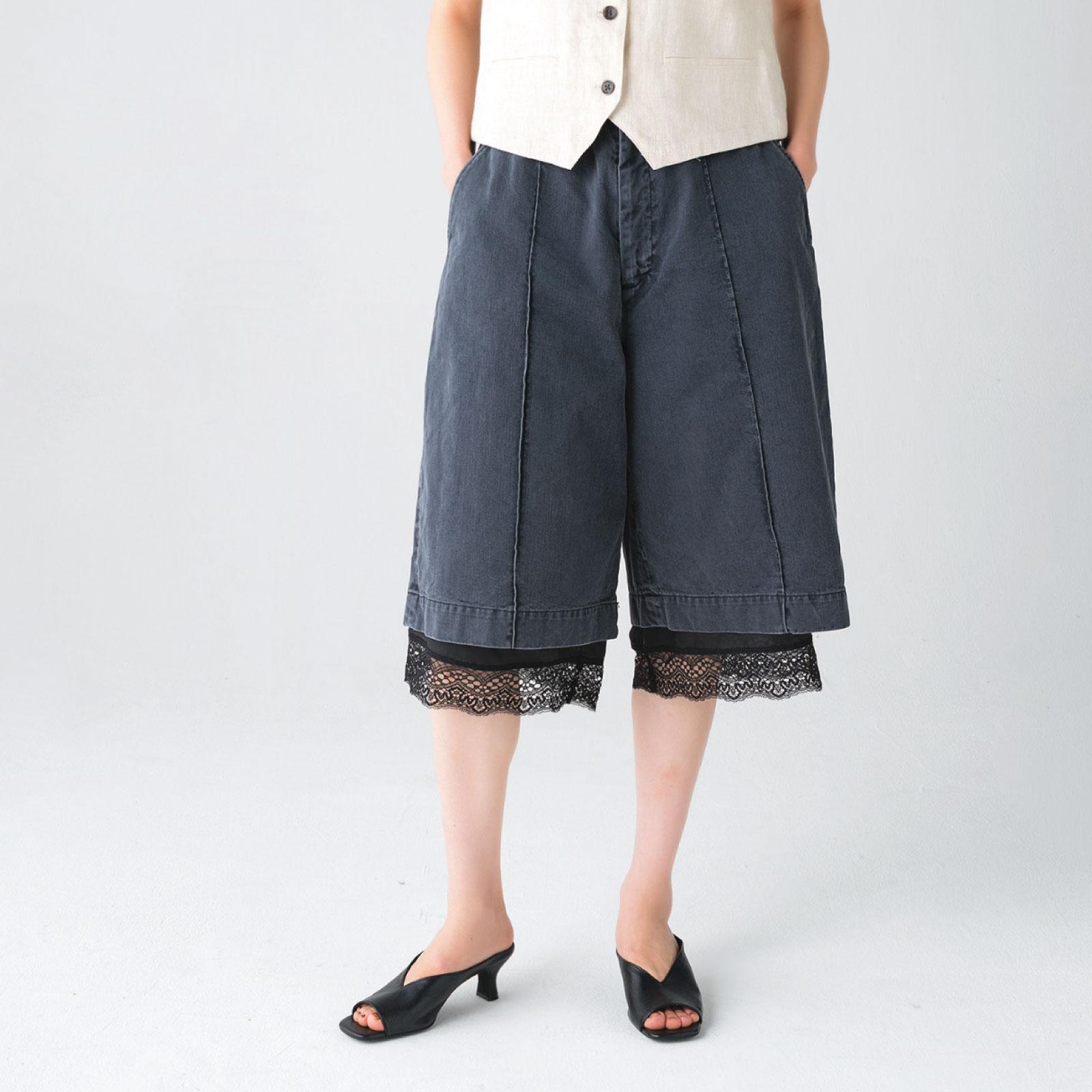 裾から覗くレースが、センシュアルなムードを演出。ハーフパンツ ¥33,000 レースキュロット ¥36,300(共にジェーン スミス/ジョン メイソン スミス ジェーン スミス ストア TEL. 03-5738-7721) ミュール ¥23,000(モリーニ/ジャック・オブ・オール・トレーズ プレスルーム TEL. 03-3401-5001)