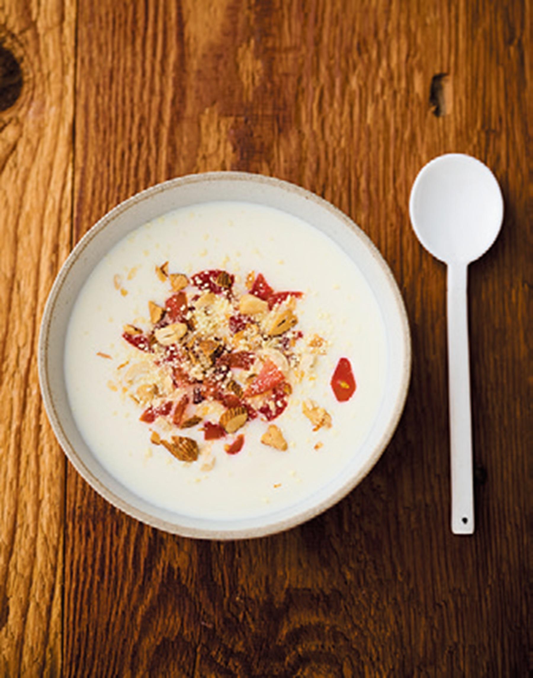 ヨーグルトに入れるのは、顆粒タイプのコンソメ。意外な組み合わせだけれど、出汁のうまみでコクのあるミルクスープ風に。
