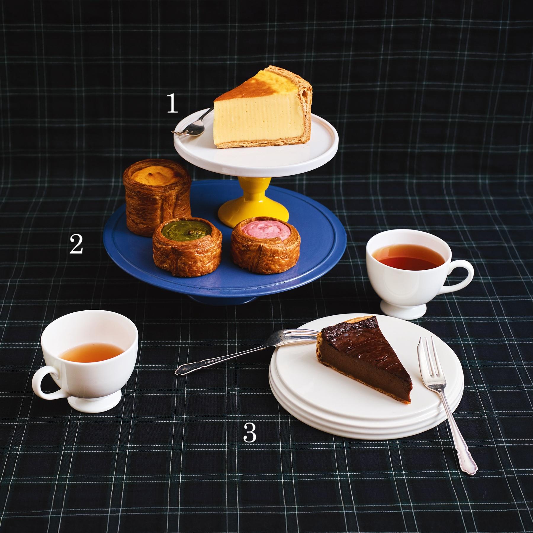 2、奥・フラン・パティシエ バニラ¥1,000 手前2つ・表参道店限定のフラン・パリジャンボックス(バニラと季節のフレーバーの3個セット)¥2,000(PAQUET MONTÉ〈パケモンテ〉エチカ表参道)