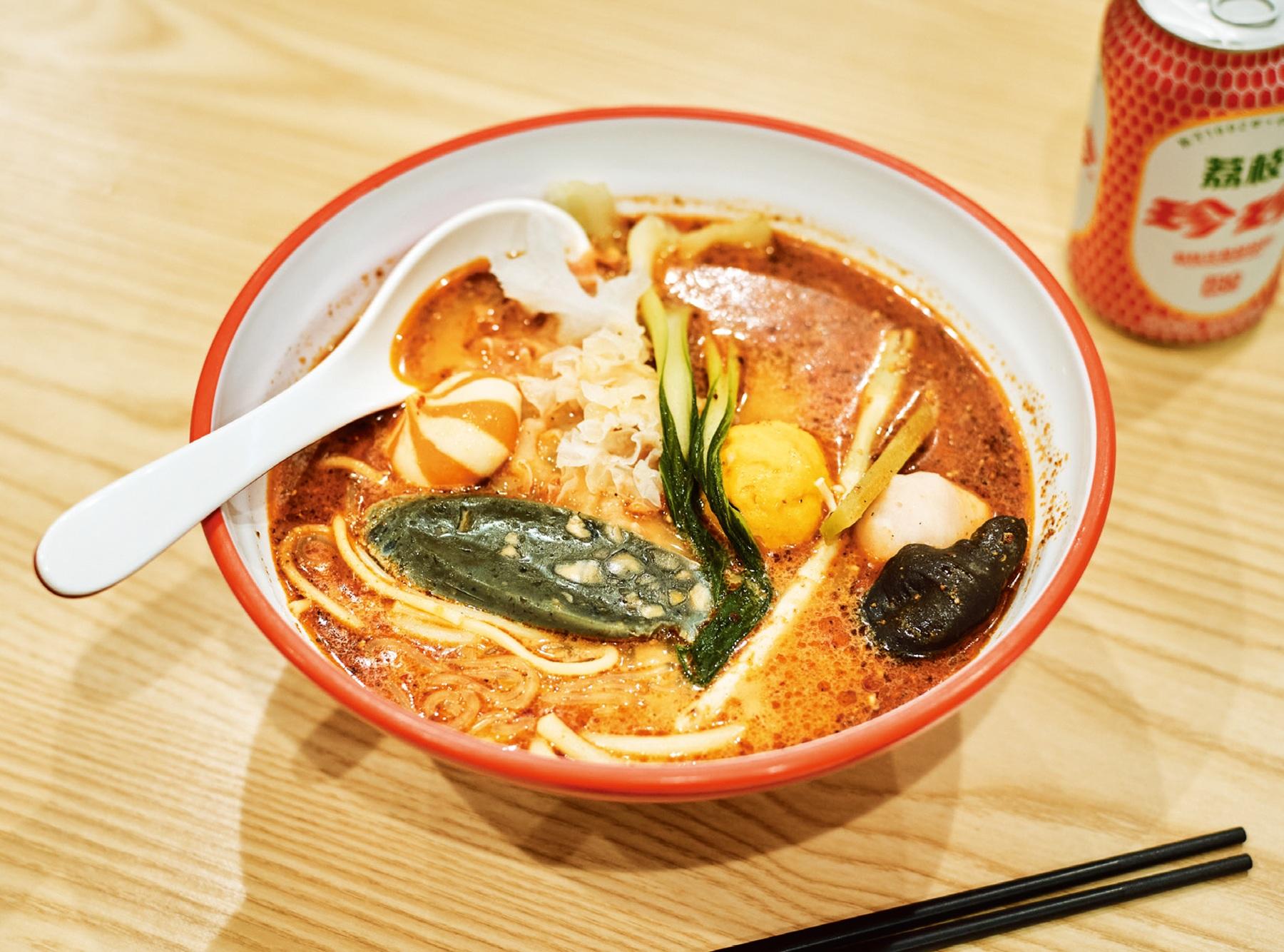 カウンターのみの店で、店内のQRコードからおすすめのセットやトッピングをオーダーすると、スタッフがショーケースから具材を取り分け、目の前で調理してくれる。「桂皮や甘松など30種類以上のスパイスを使った薬膳スープが特徴。クリームソーダもあり、ピリ辛の間の箸休めとしてはもちろん、写真映えも抜群」