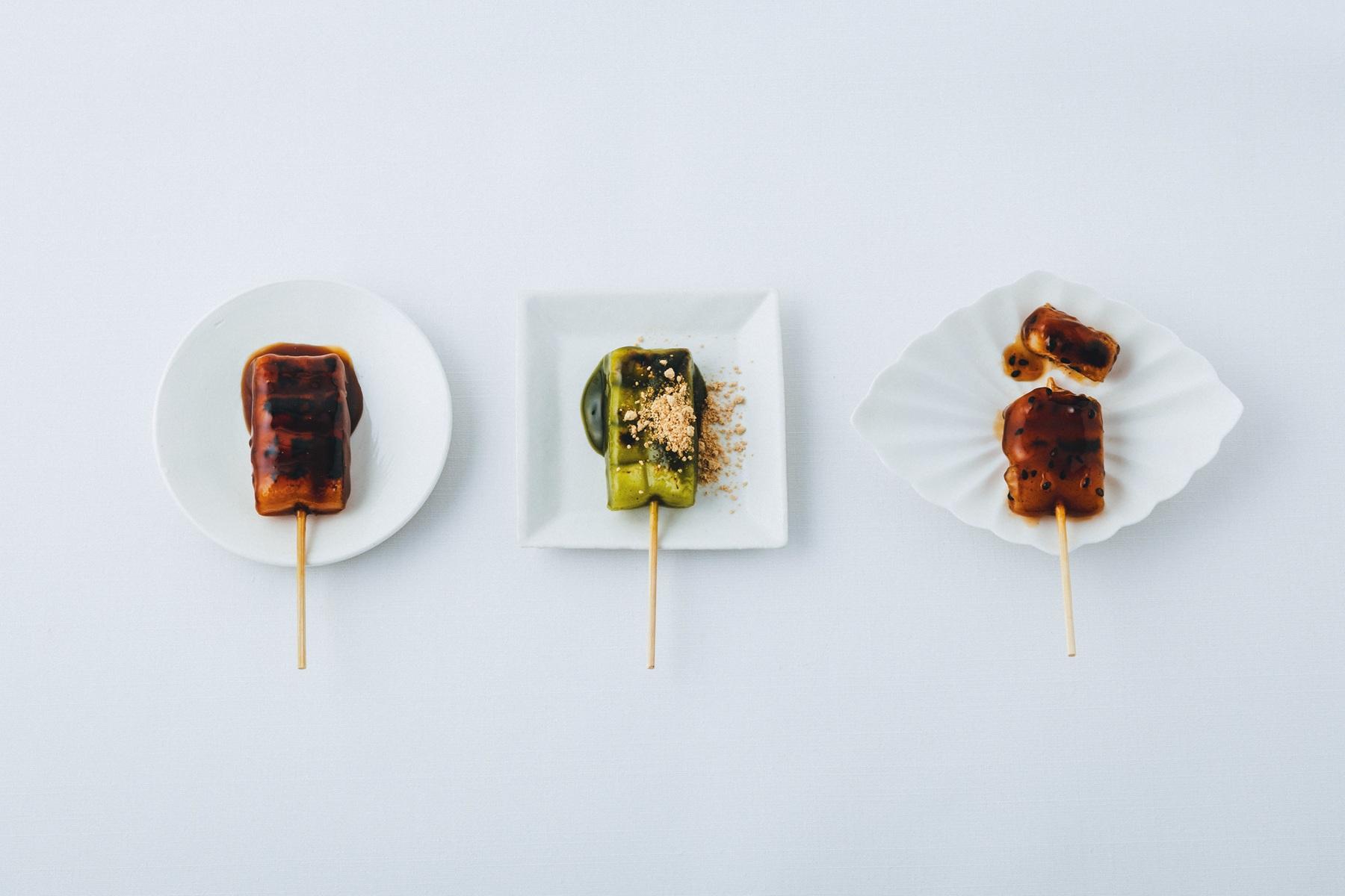 左から、独特の歯切れの良さに俵型のお団子がトレードマークのみたらし団子(5本594円)。宇治抹茶みたらし(5本670円)は、京都産の宇治抹茶を使用した上品で香り豊かな特製タレが絶品。別添えのきな粉をトッピングすると、香ばしさと風味がふわっと広がる。京風だしの効いた、京だし醤油七味みたらし(5本648円)は、タレに京都・祇園『原了郭』の黒七味が使用されていて、ピリッとくる辛みが、甘みと旨味を一層引き立てる逸品。