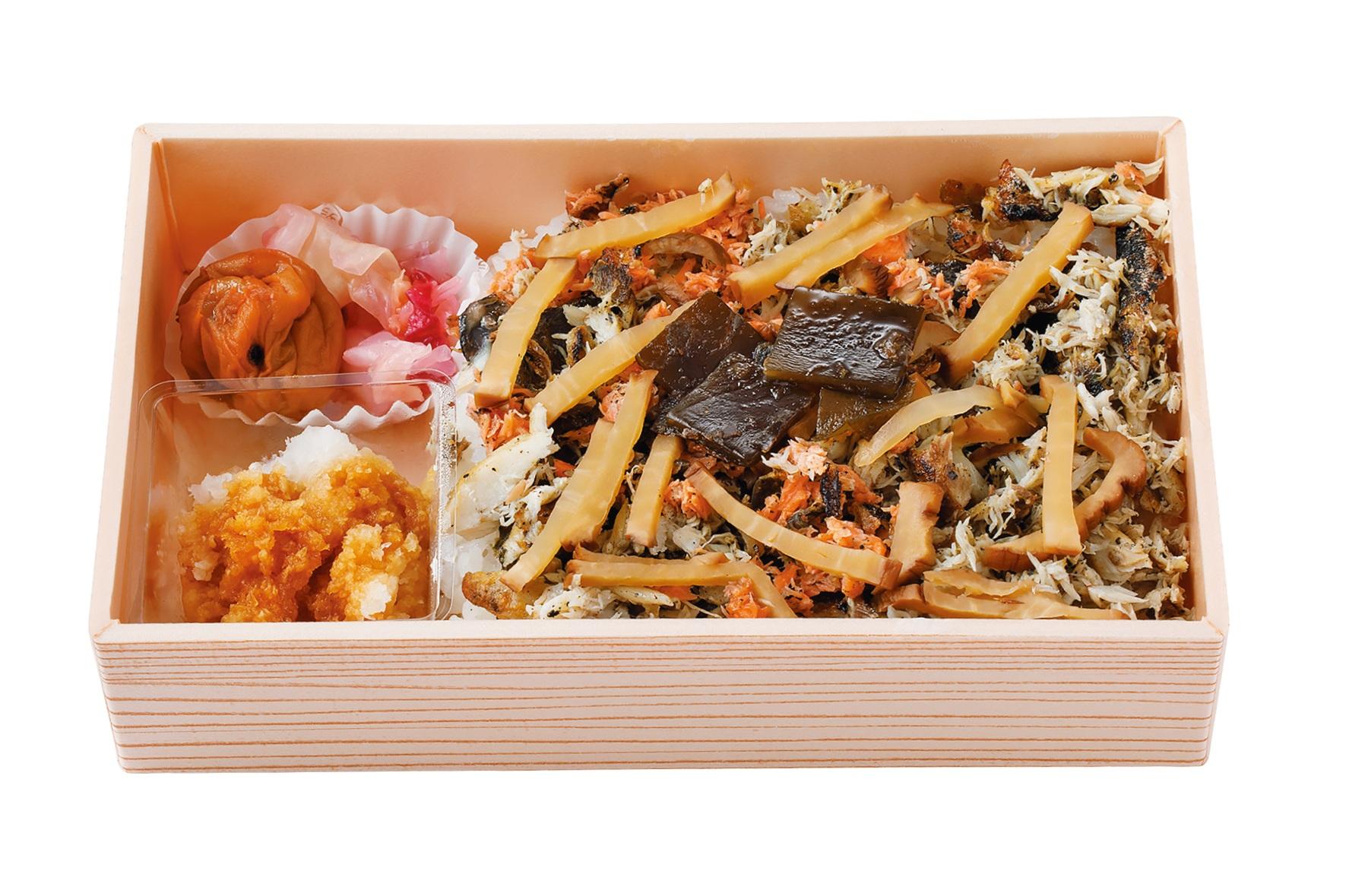 ① 炭火焼き魚弁当 すみさわの「色々焼き魚ほぐし身 いぶりがっこのり弁」