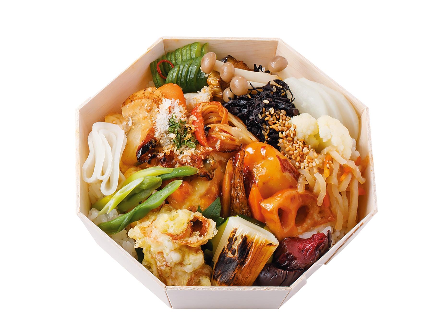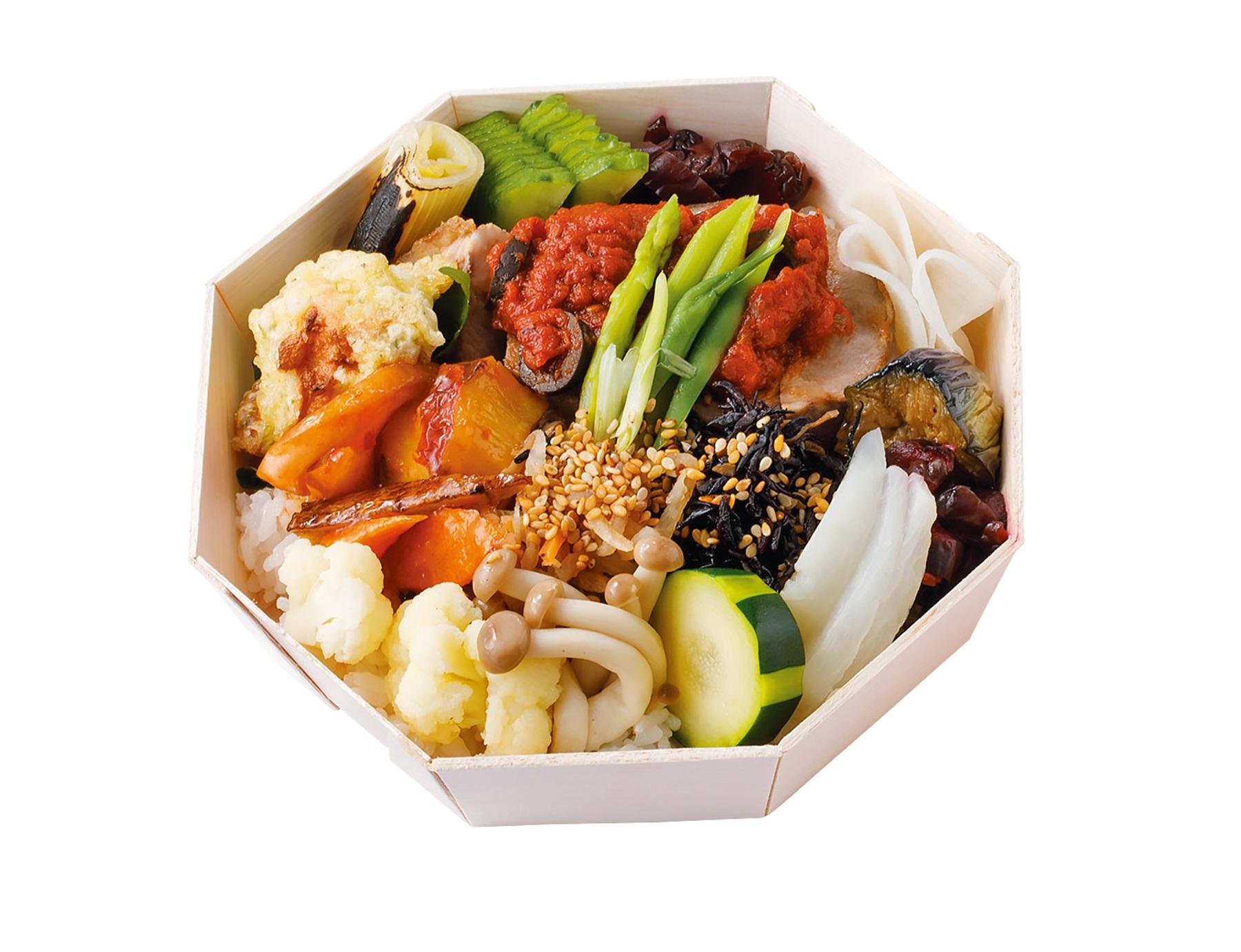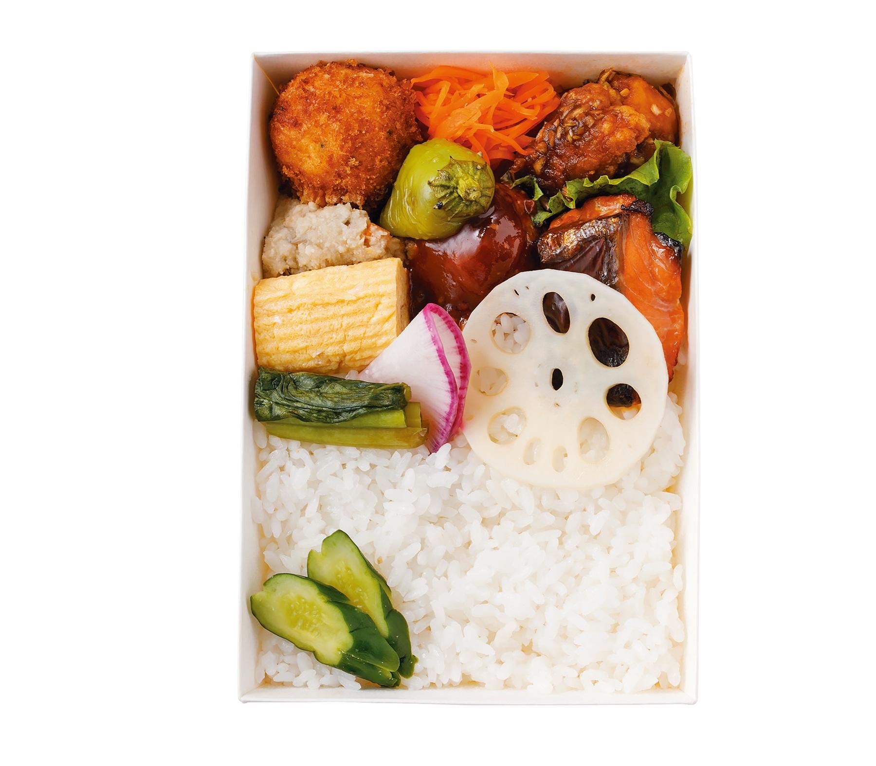 あきたこまちのご飯の隣に、ハンバーグや香味豆板醤唐揚げ、秋鮭の秋田味噌漬け焼きなど肉と魚のおかずと、多種の副菜が並ぶ。メニューは週替わりで野菜たっぷり。「『chioben』と『松庵文庫』のイズムを汲んだ期待の新星。みんなが好きなおかずが揃い踏み、どんな現場でも愛されます」(編集F)