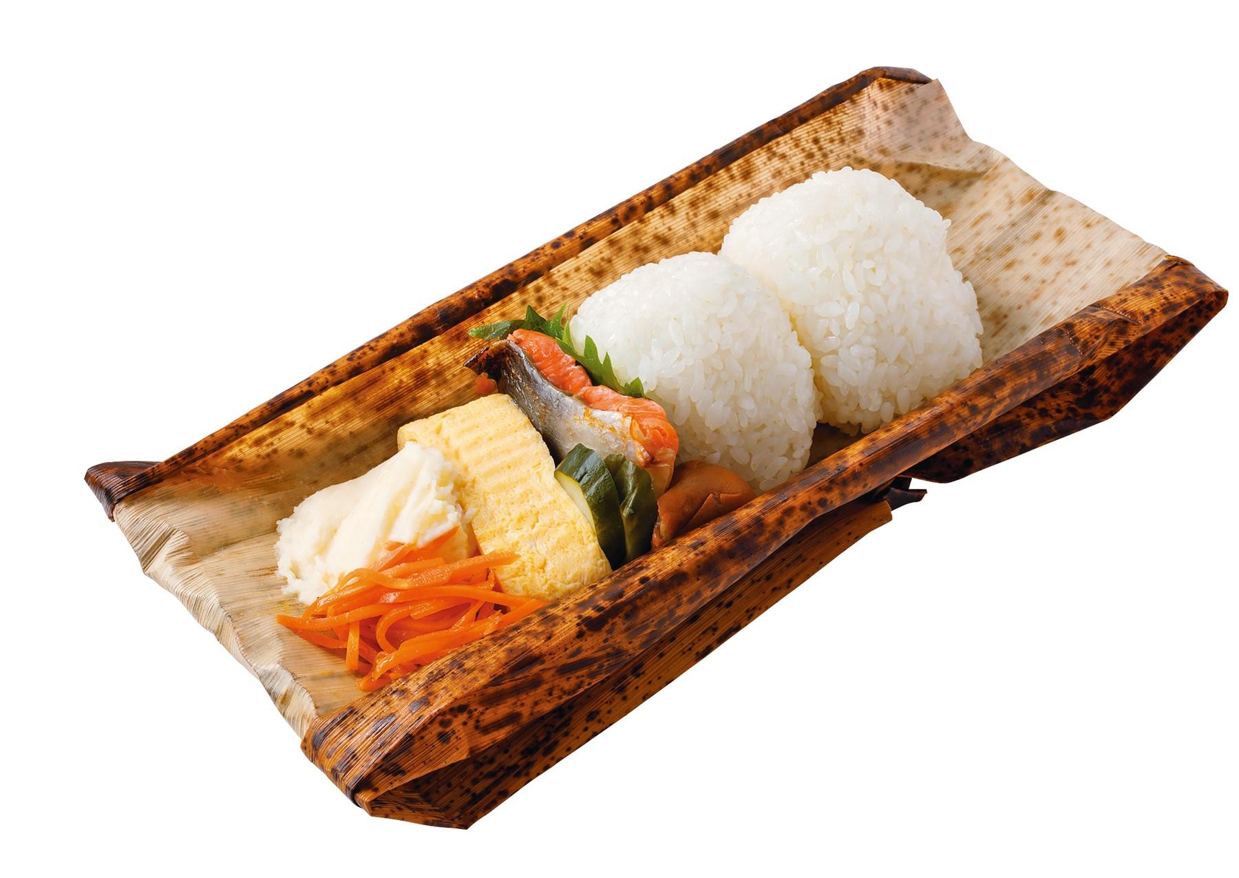 “まぼろしのお米”とも呼ばれる五郎兵衛米を土鍋で炊いた塩むすびは甘みと粘りがあり、冷めても美味しい。銀鮭の酢橘幽庵焼きや新生姜の出汁巻き卵など、旬の食材を使った多様な惣菜も一緒に。「竹皮に包まれた姿が素敵。お米大好きな男性アイドルの方が2個召し上がりました。スタッフ人気も高い」(編集N)