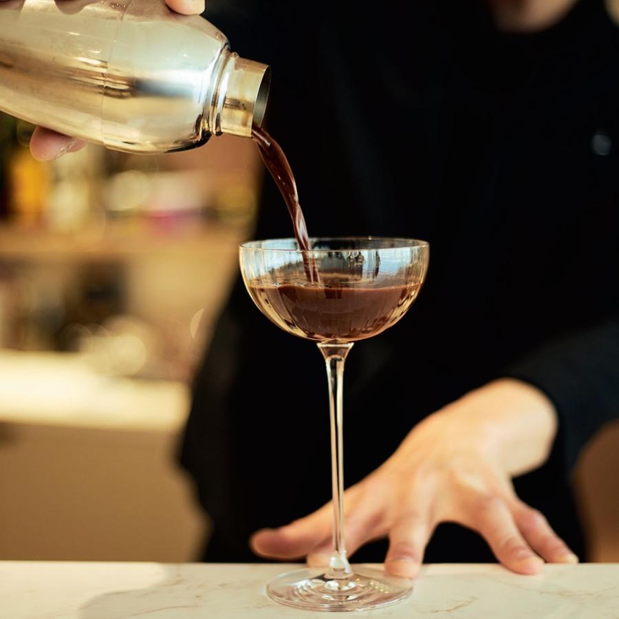 たとえば、極限までなめらかにしたみずみずしいガナッシュを閉じ込めた「ショコラ・コキーユ」には、ビターなカクテル、ネグローニを。やわらかな甘さのチョコレートをネグローニのほろ苦さが包み込み、カカオの余韻はより深く、エレガントな大人のデザートへと昇華する。