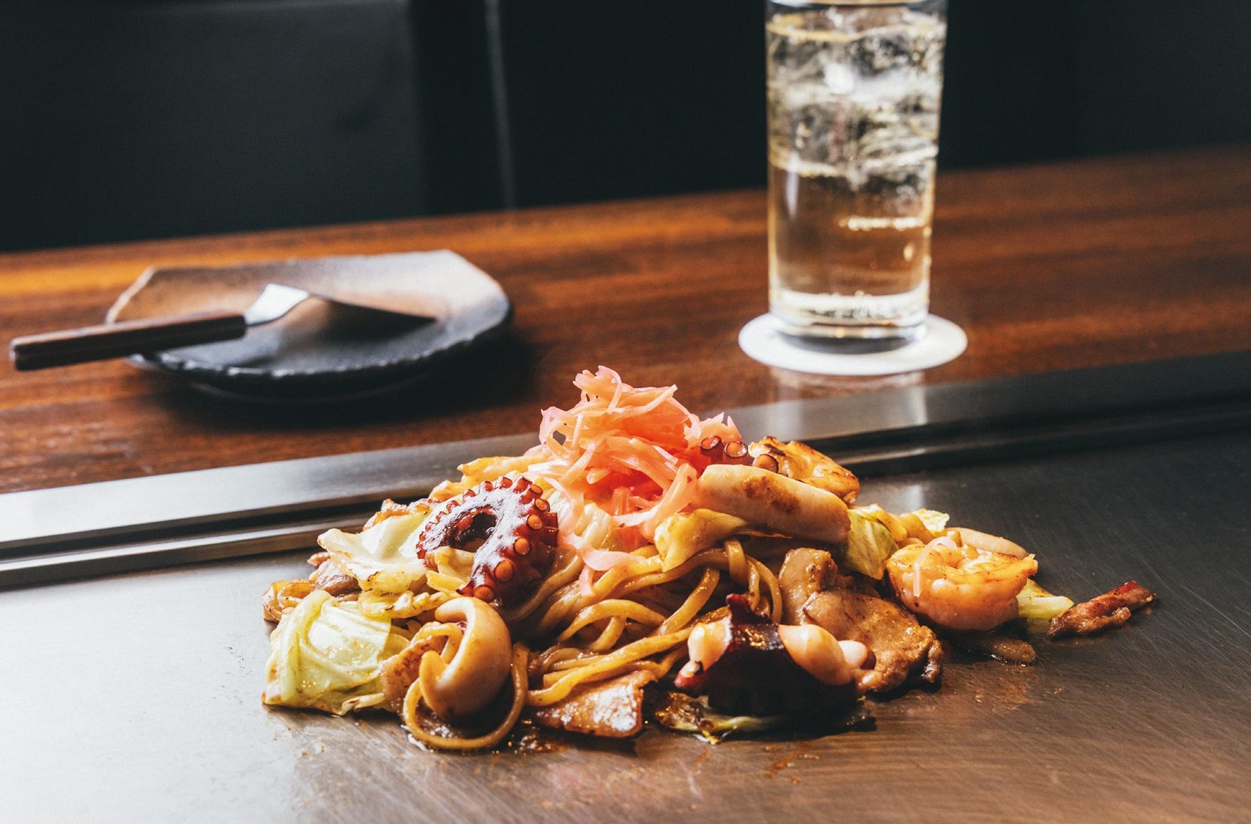 隠し味に甘みのあるお好み焼きソースを使ったミックス焼そば ¥1,716。碧Ao海薫るハイボール ¥1,188。