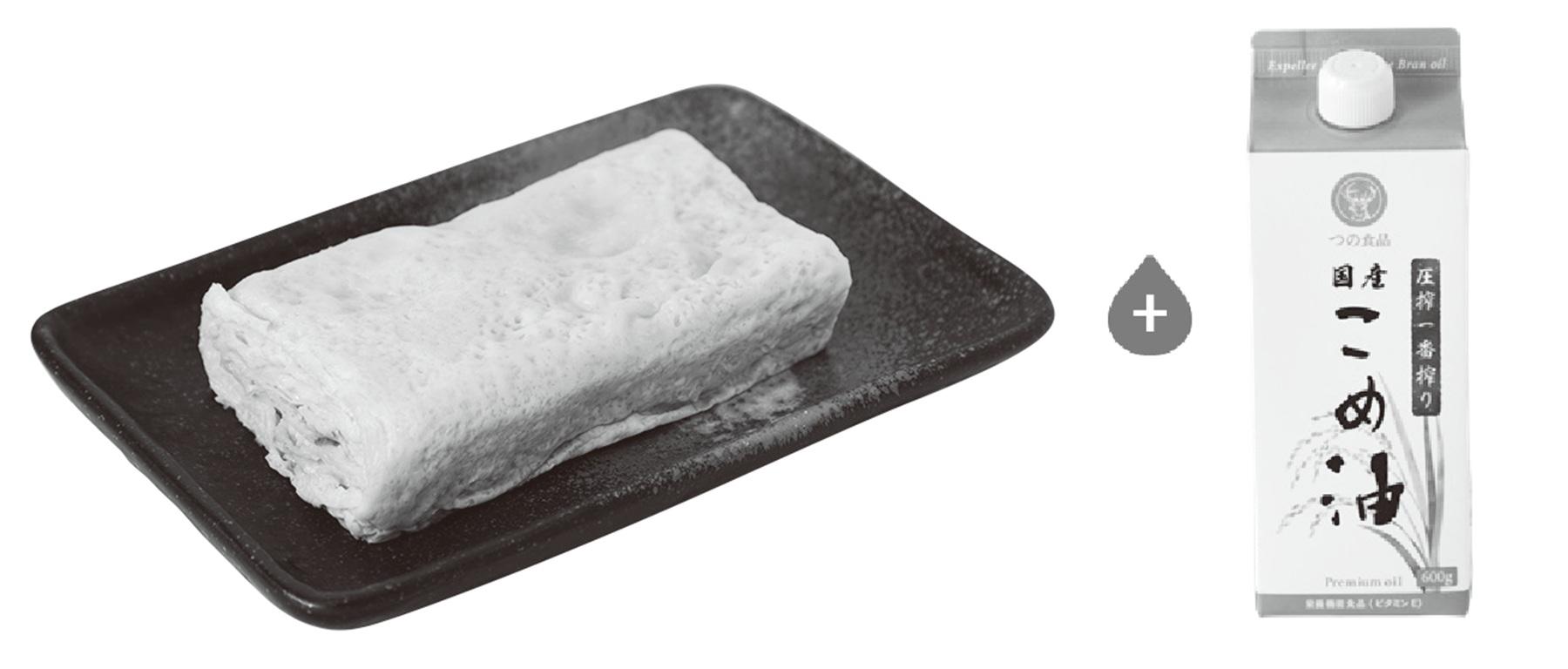 加熱しても栄養素が比較的残りやすいので、卵焼きを作る際の油として使用。「軽くサラッとしているため、卵の旨みを活かした仕上がりに」。米油は比較的安価のため、サラダ油代わりに日々の料理に使用するのもあり。圧力のみで搾られた「圧搾一番搾り 国産こめ油 紙パック600g TSUNO」¥1,296。米ぬかの栄養成分「γ-オリザノール」の含有量が高く、大さじ1で1日に必要なビタミンEの半分以上が摂れる。