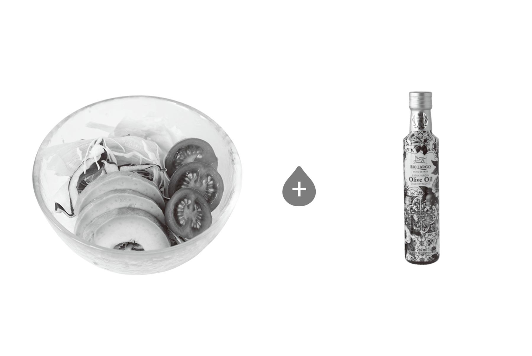 「オリーブオイルのフレッシュな風味を活かしたいので、生野菜にたっぷりかけて、味つけは塩のみでさっぱりと」(青木さん)。サラダの具材は、アボカドやトマトなど食物繊維が豊富で、栄養価が高いものを合わせるのがよい。手摘みしたオリーブを鮮度が良い状態で搾油。フルーティな香りがたまらない「【南アフリカ産 デザイン3種】リオラルゴEXVオリーブ油 250ml瓶」¥2,484。3種類のボトルデザインから選べる。