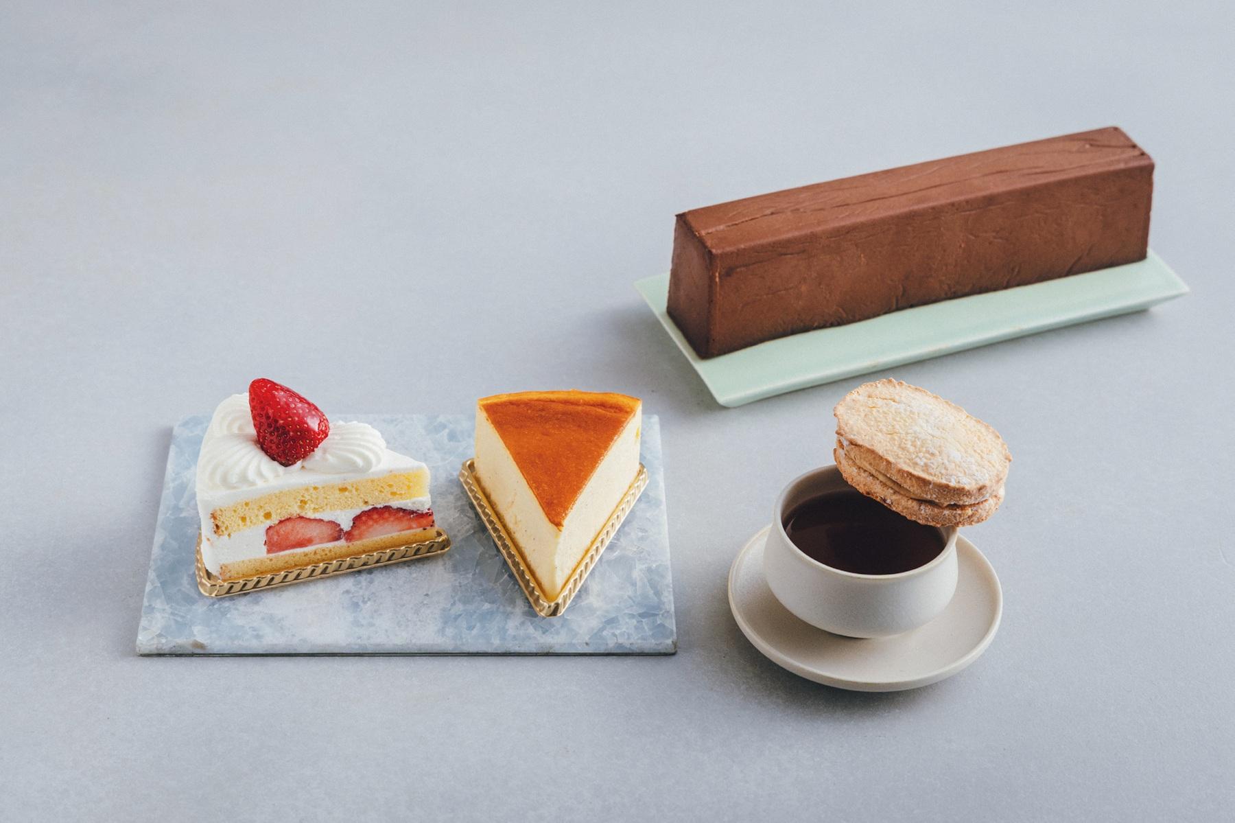 手前左から、「苺ショート」800円、「チーズケーキ」750円、自家製の落花生プラリネのこうばしい香りと塩気がたまらない「落花生ダクワーズ」330円。奥・「テリーヌショコラ」3900円(22.5cm)は、ねっとりしすぎずスッと溶け消える儚さとパワフルなカカオ感を併せ持つ。