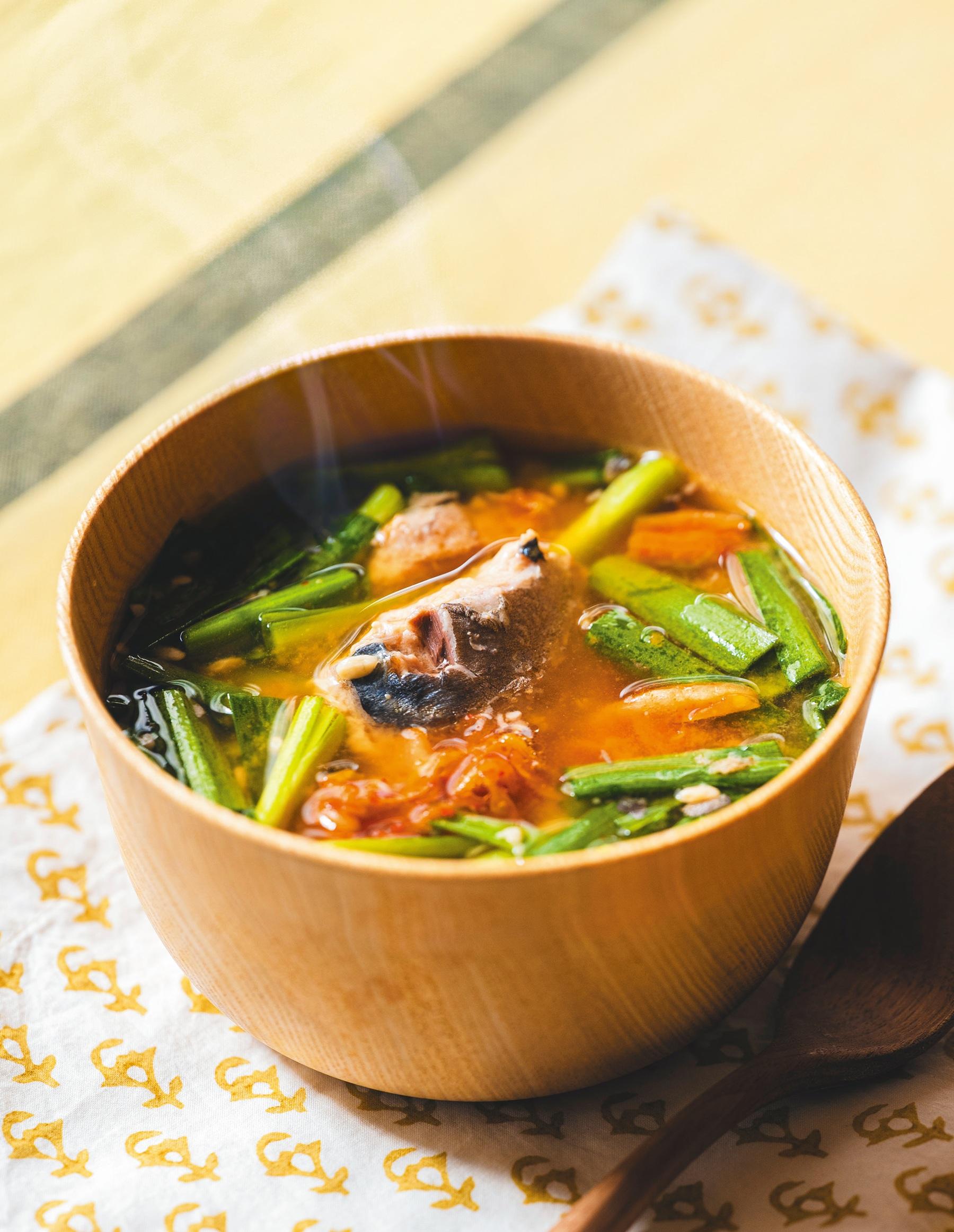 「ストレス解消は冷え取りがカギに。サバは、『気』と『血』の流れを良くし、体を温め、巡りを良くしてくれる食材です。ニラは春の季語でもあり、別名『起陽草』と呼ばれ、陽気を起こすスタミナ薬草として有名です。キムチや生姜などの辛味は元気を与え、全身のエネルギーの巡りを整えてくれるので、この一杯でポカポカに!」