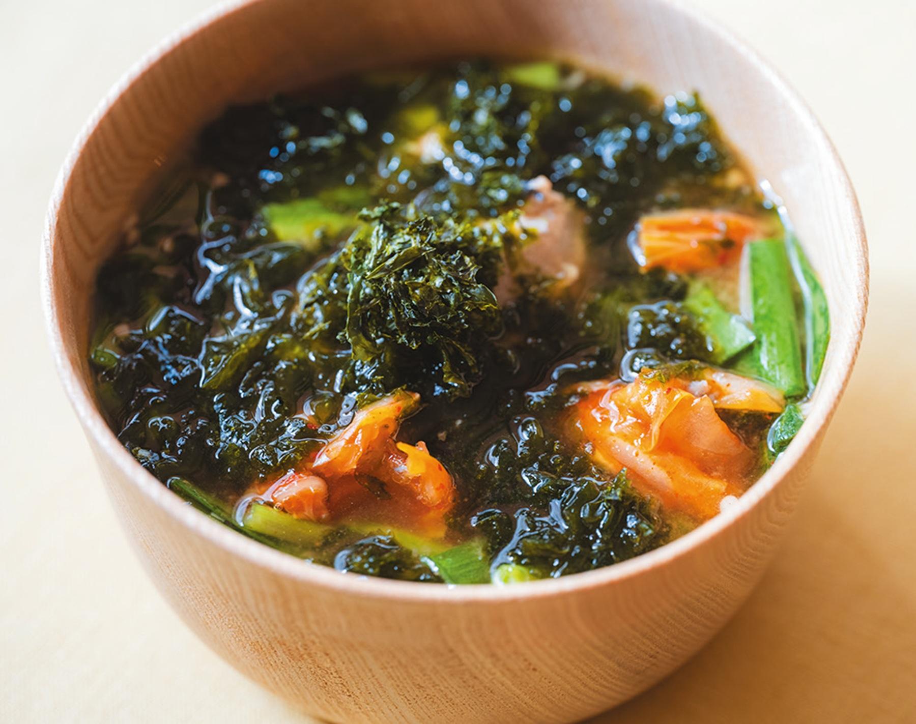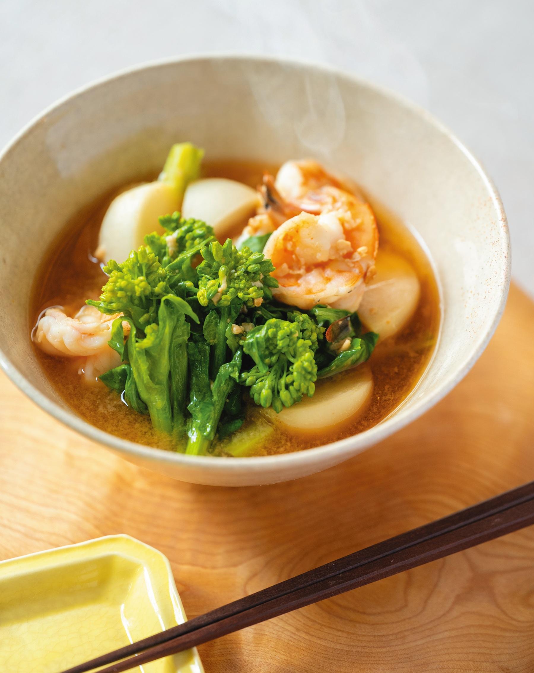 カブとエビは体を温める食材の極み。ホクホクのカブと、プリッとしたエビは食感はもちろん、味の相性も抜群。そこに春の訪れを告げる菜花を加えることで、温かみ溢れるみそ汁に