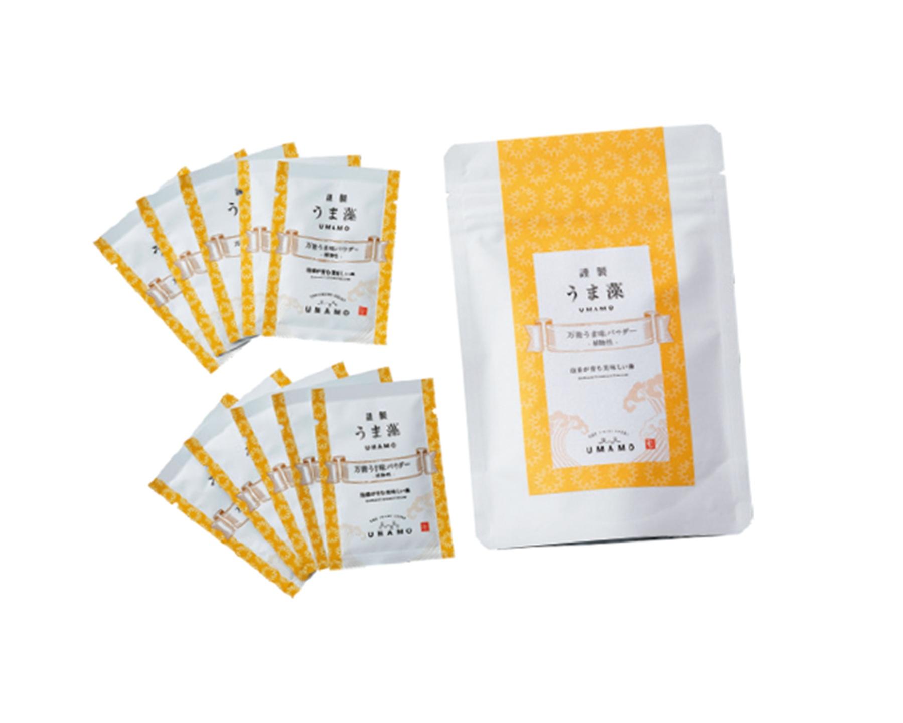 うま藻/栄養価とともに旨みも海藻の魅力。こちらは沖縄の小さな藻100%の天然うま味調味料。青魚をはるかに超えるDHAと、羅臼昆布の1 .5倍以上の旨みを併せ持つ。味はからすみのようで、炒め物に和え麺にと万能。1g×10袋入り ¥1,620 。https://umamo.jp/