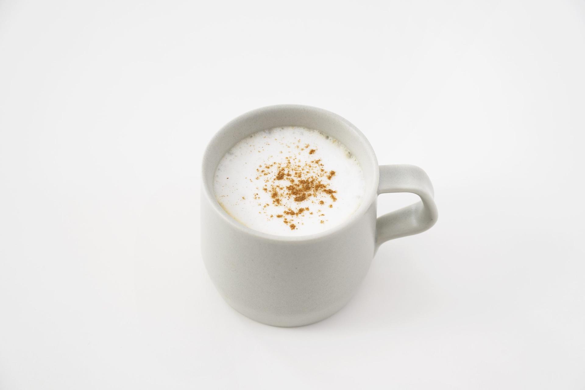 ④ 同じ鍋に仕上げ用の牛乳1/4カップを入れて中火にかけ、温まったらミルクフォーマーで泡立ててカップに加え、軽く混ぜる。好みでシナモンパウダーをふる。