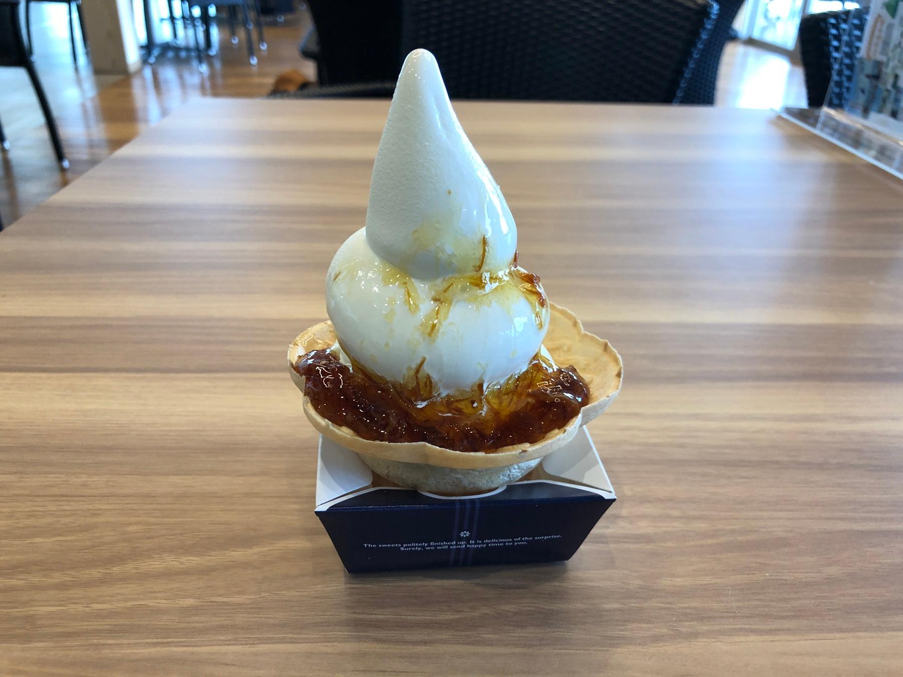 「ふかひれのコリコリとした楽しい食感と、濃厚なバニラとはちみつの味わいに大満足。もりっとしたソフトクリームの形も可愛いです。ここは海苔の佃煮を練り込んだソフトクリームもあって、甘じょっぱくて美味ですよ」