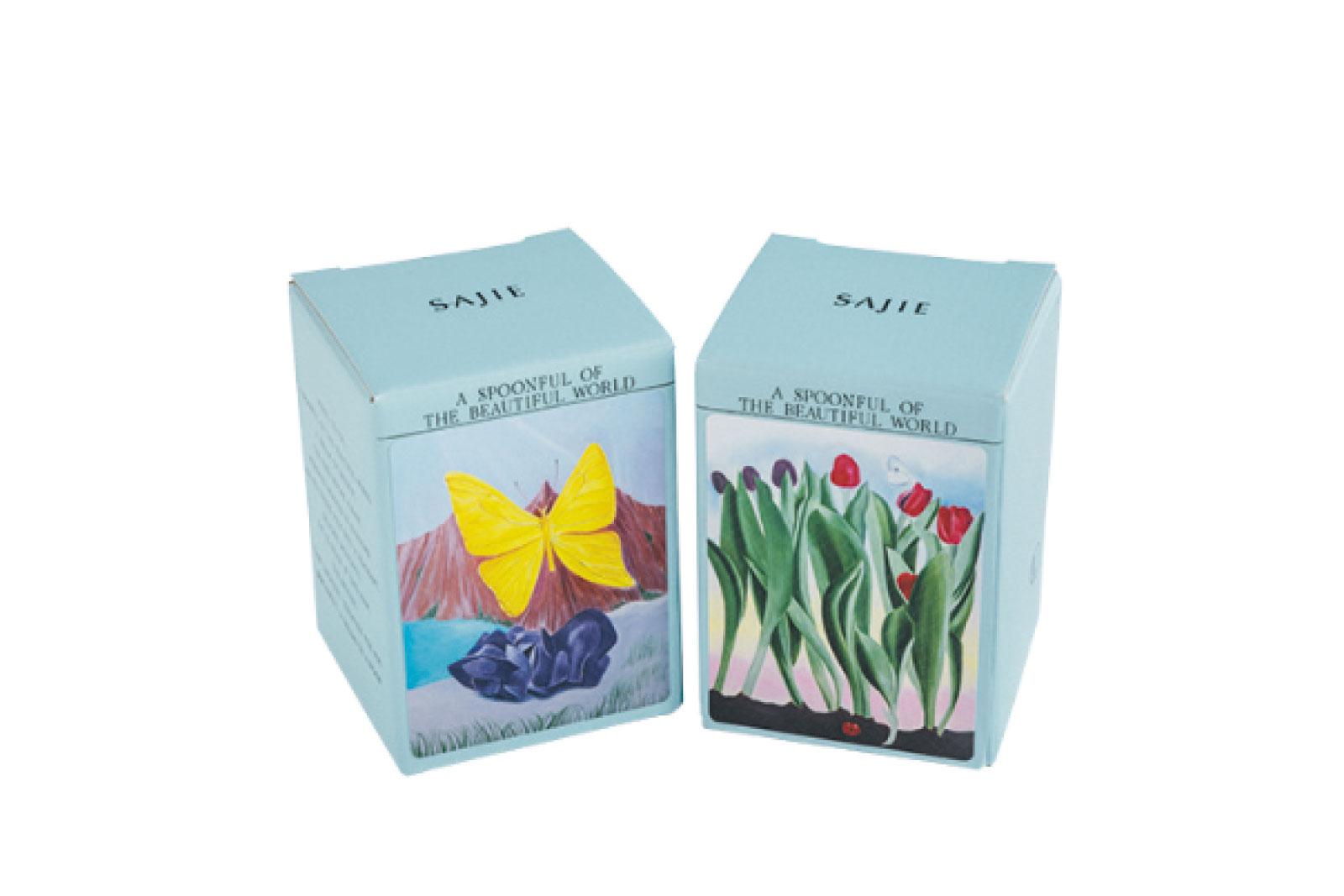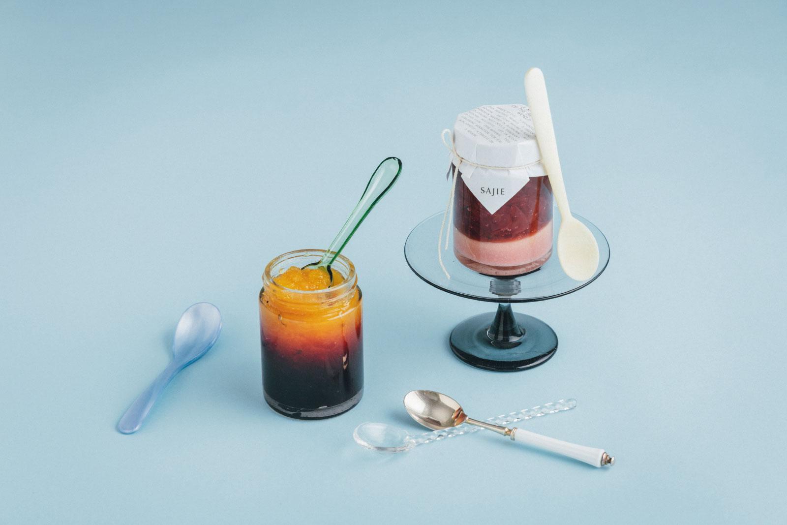 左から、「カシス&パインディル」 ¥3,240、「さくらミルク&ローズレモングラス」 ¥3,024。ブランド名・SAJIEの由来は、匙(スプーン)から。監修をつとめるのは、『パティスリィ アサコ イワヤナギ』のシェフパティシエール岩柳麻子氏