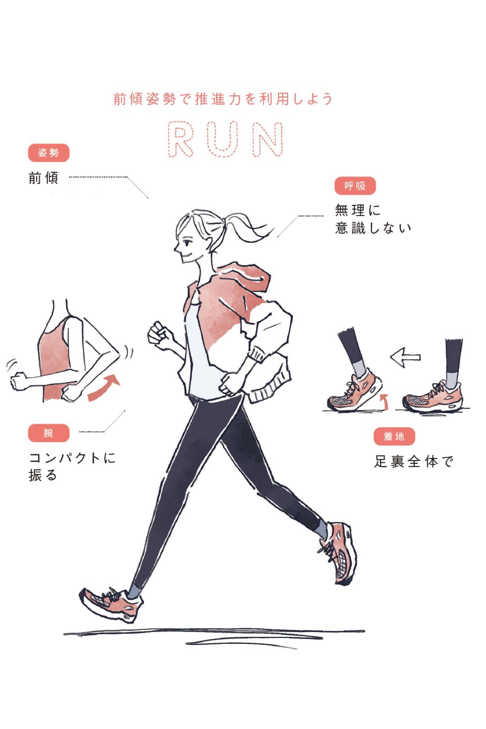 - 姿勢…前傾/頭を、少しだけ斜め前に糸で吊られているようなイメージを持ち、前傾姿勢で走る。すると、体が自然と前に押し出され、走りが軽やかに。キレイなランニングフォームにも近づける。