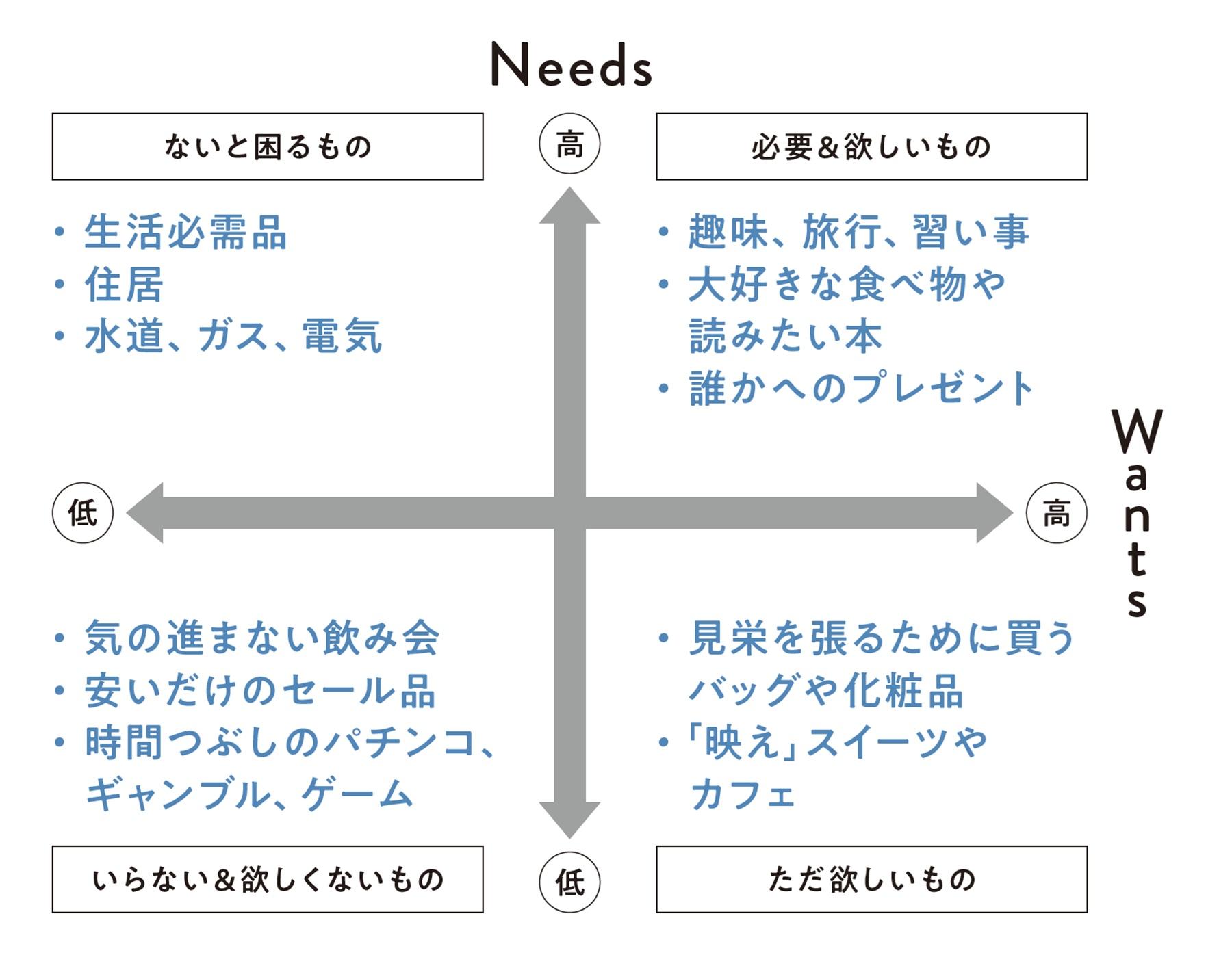 出費をNeeds(必要)とWants(欲しい)で区分してみると、それがどんな出費か考えるきっかけに。右下にくるものはほどほどに楽しもう。