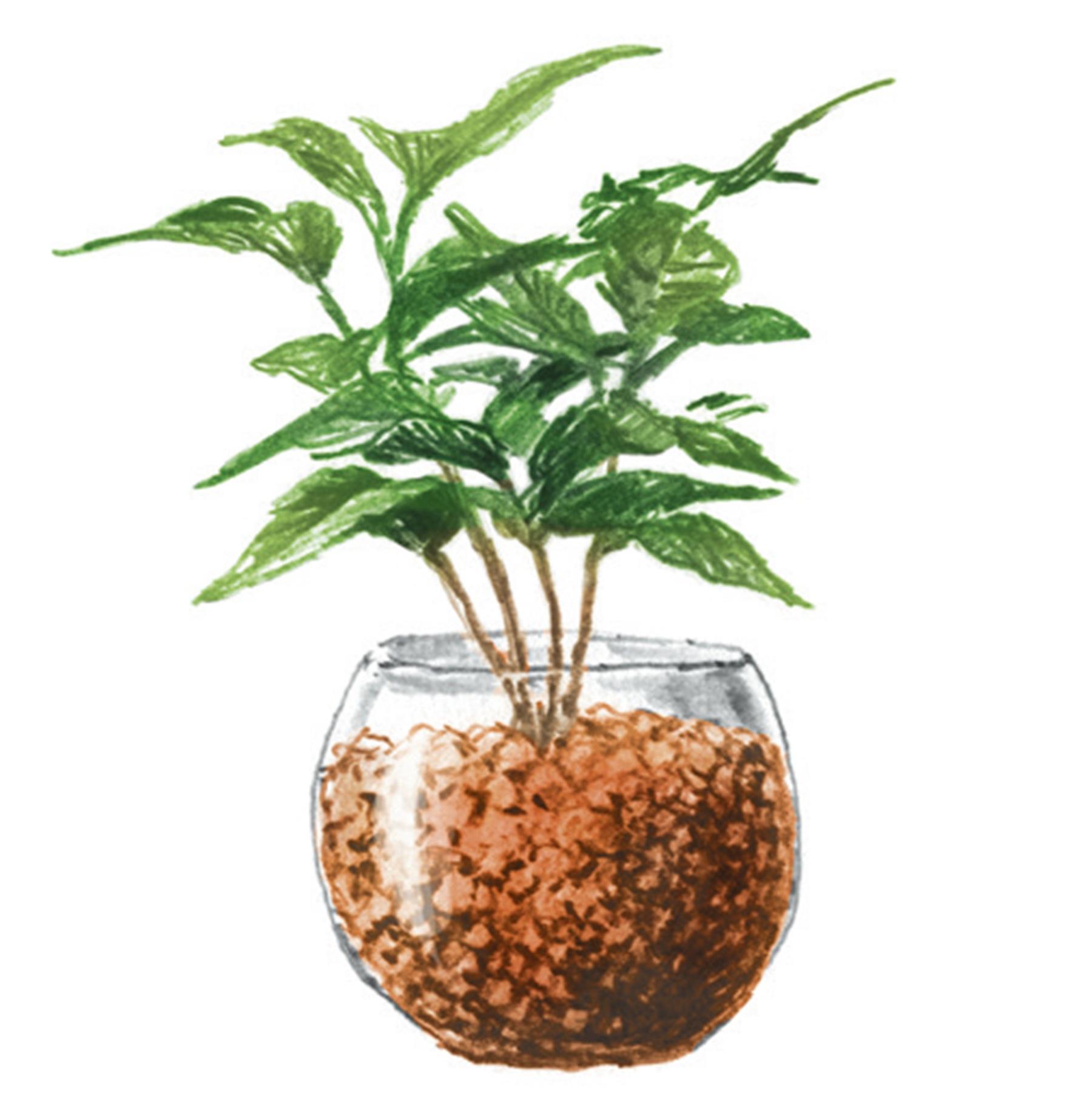 ハイドロカルチャーとは、品種名でなく水耕栽培苗のこと。「用土を使わない栽培のため、土中の有機分を好んで湧いてくるコバエなどの虫の発生率が低くなり、カビも抑制できるため室内でも清潔に育てることができます」。植物と一緒にハイドロカルチャー専用の肥料を購入すると、栄養失調を防止でき、すくすくと成長してくれる。
