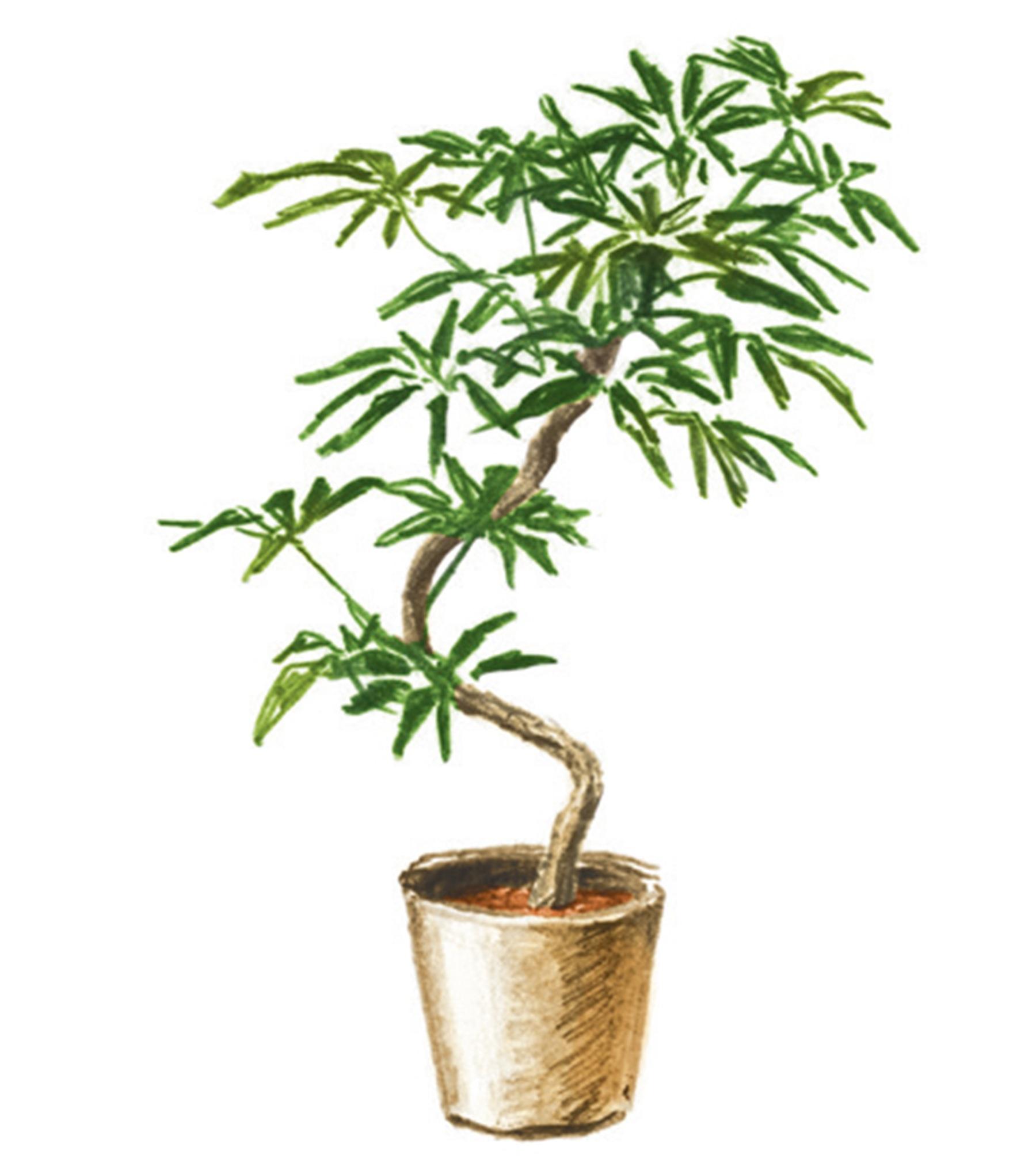 世界の熱帯から温帯に約600種が自生するシェフレラなど、樹木っぽい観葉植物がおしゃれ。「個々に樹形や幹の太さなどが違うため、自然樹形の野性的なデザインから、生産者がS字に曲げた仕立て物まで、デザインも様々で、一期一会の出合いが楽しめます」。ウンベラータ、アルテシマ、ベンガレンシスなどのフィカス系も人気。
