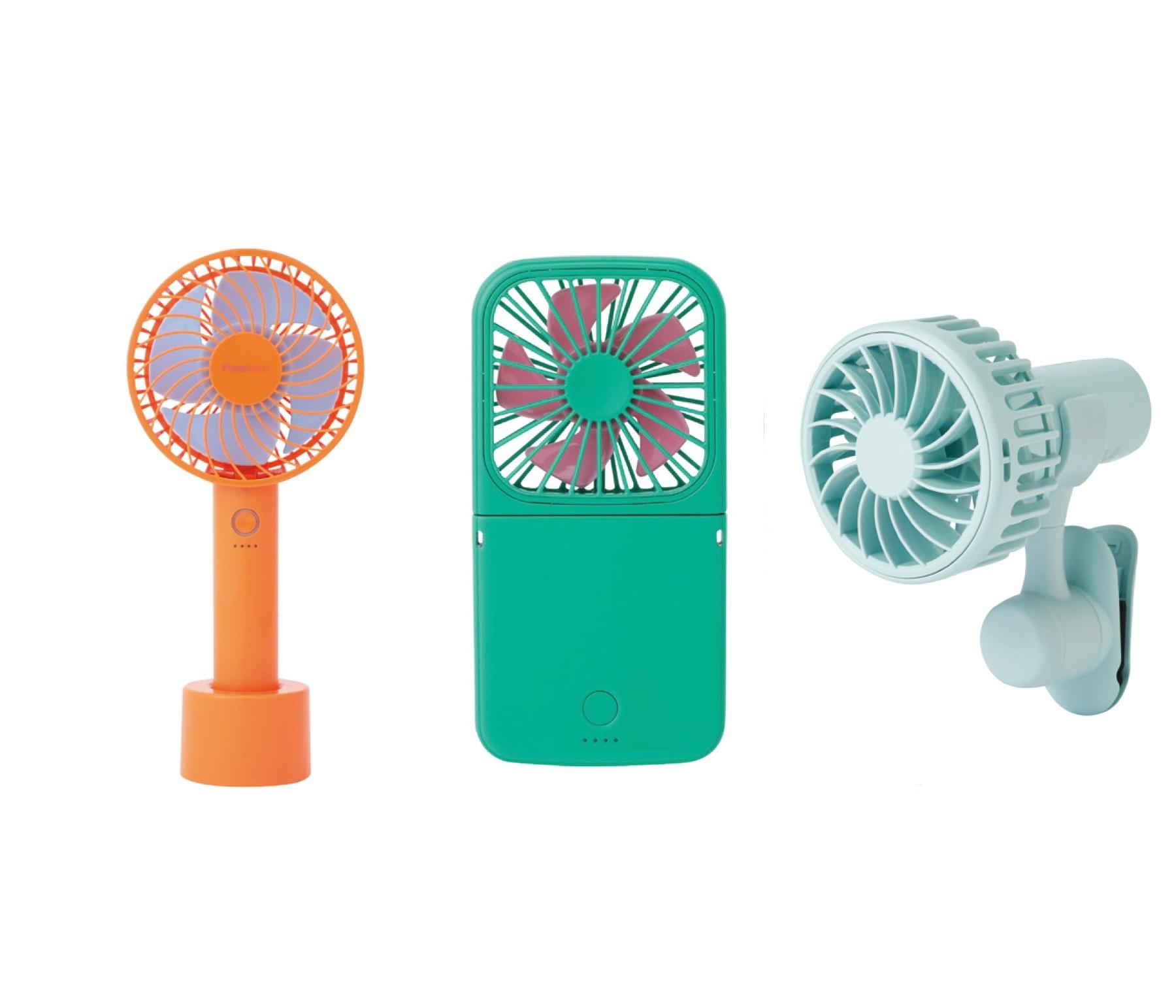 「ハンディファンのパイオニア的存在。毎年新作が複数登場し、用途に合わせて選べ、カラバリの豊富さも人気」。フレ ハンディファン(¥2,680~)は卓上でも携帯型でも使えるUSB充電式2WAY。フレスマートハンディファン(¥2,680~)は折り畳み式。フレ ミニファン(¥2,480~)はシリーズ最軽量で、付属のクリップで日傘やバッグなどに取り付け可。(フランフラン TEL:03・4216・4021)