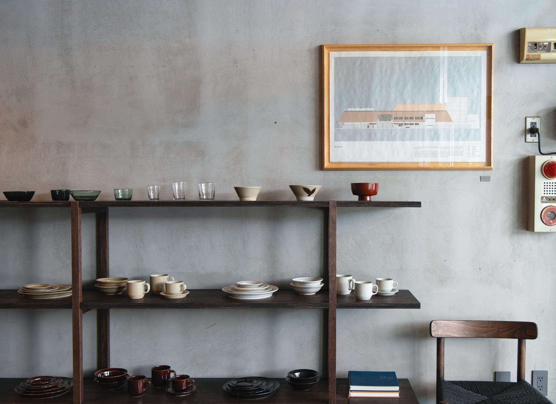 店内に並ぶオリジナルの家具とプロダクト。食器類は、作家物と大量生産品との間のような、絶妙な雰囲気が魅力。