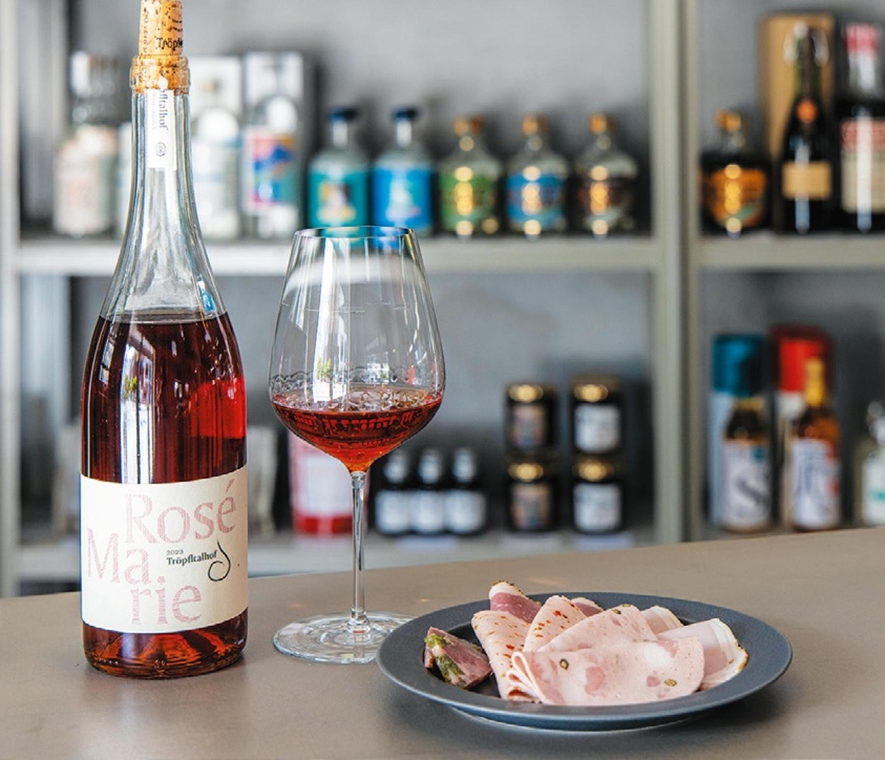ナチュラルワインは90mlで¥800~ TESIO2×の自家製ハムの盛り合わせ¥1,300 他に日本酒やスピリッツ、クラフトビールなども楽しめる。