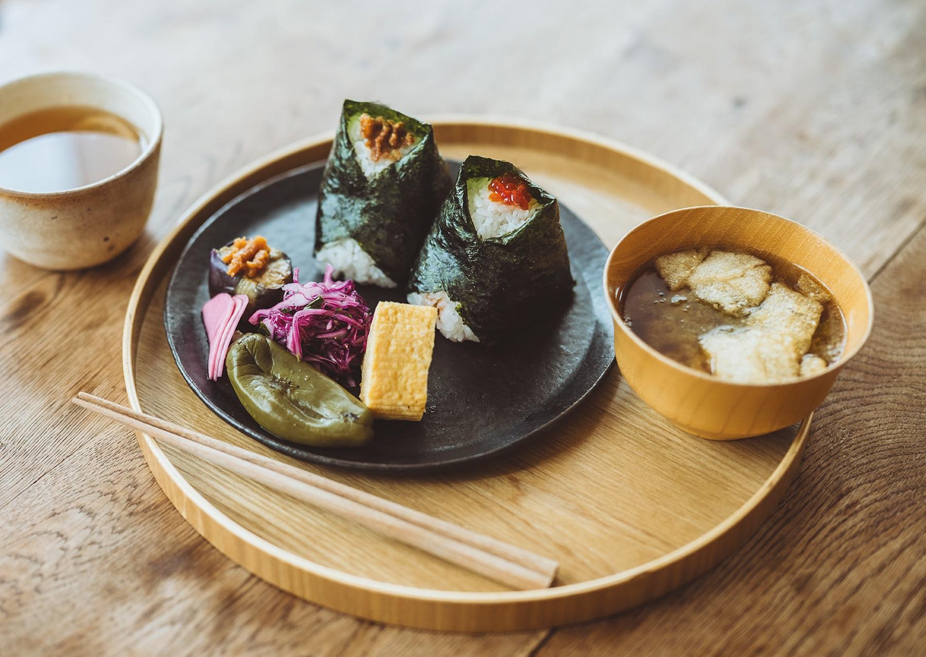 2つのおむすびと日替わりの副菜、味噌汁がついた「おむすび定食」¥1,100~。おむすびを握るのは奈々さんの仕事。手作りの焼き菓子やドリンクも豊富で、無農薬レモンのレモネードに、ローズマリーやクローブなどを配合した「スパイスレモネード」¥650もおすすめ。