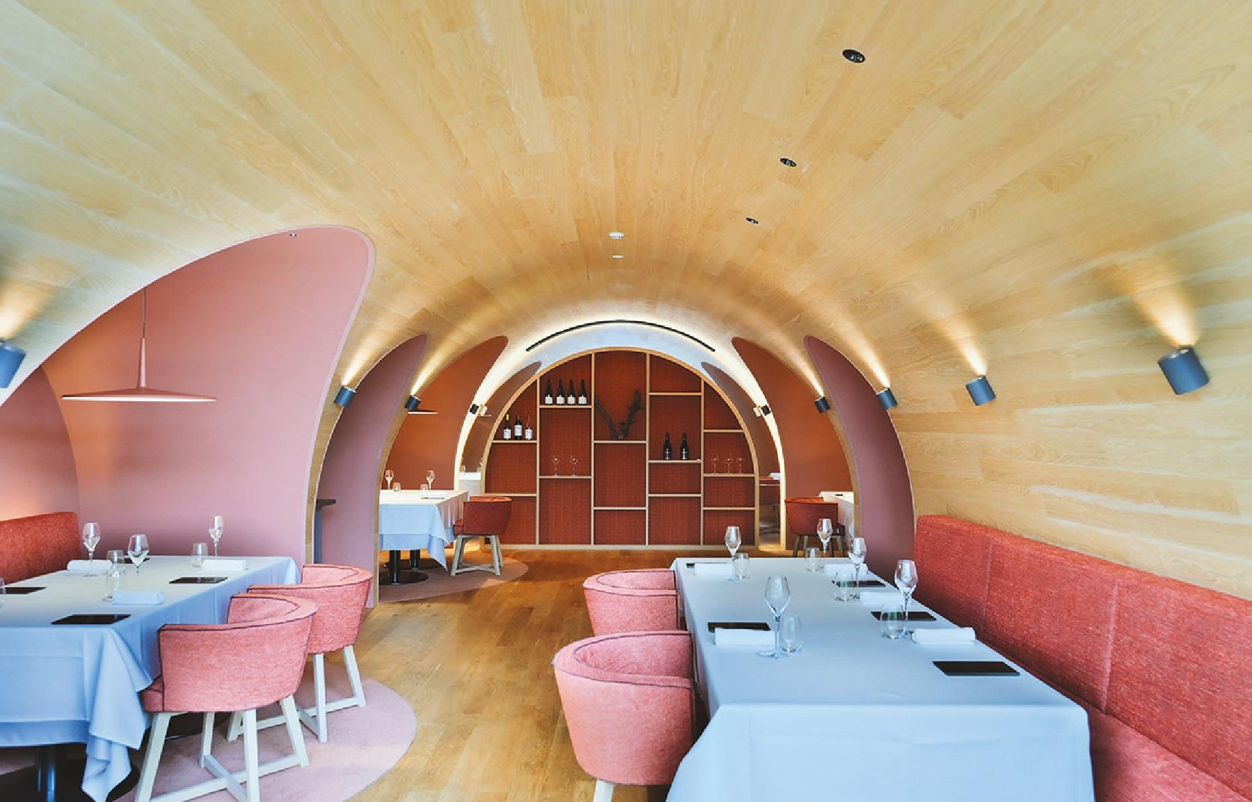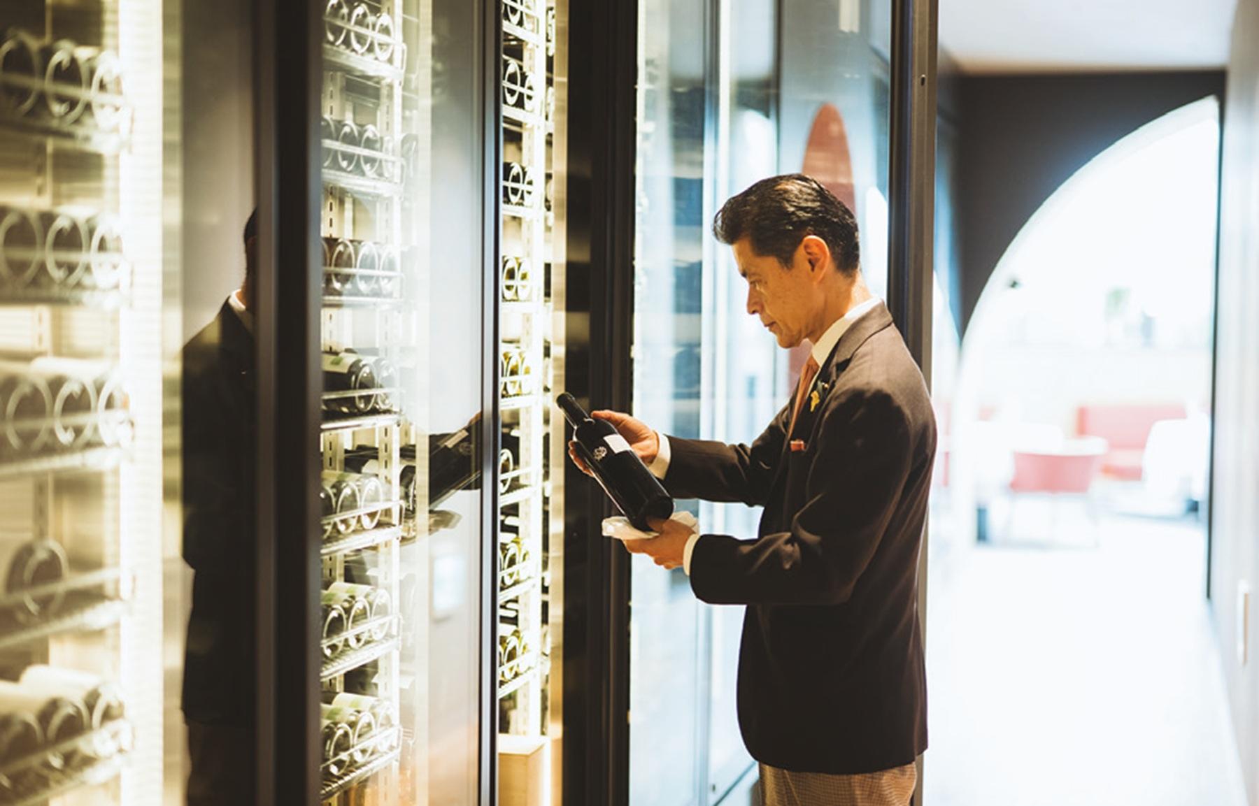 ボルドーカラーで統一された人気の客室「ワインスイートメゾネット」。この客室のためにソムリエが厳選したワインを収めたセラーやタンブラーを備え、ワイン三昧の滞在が叶う! 『OTTO SETTE』の秋限定ディナーコース1名¥18,000、ペアリングコース¥9,500(~12/3)。