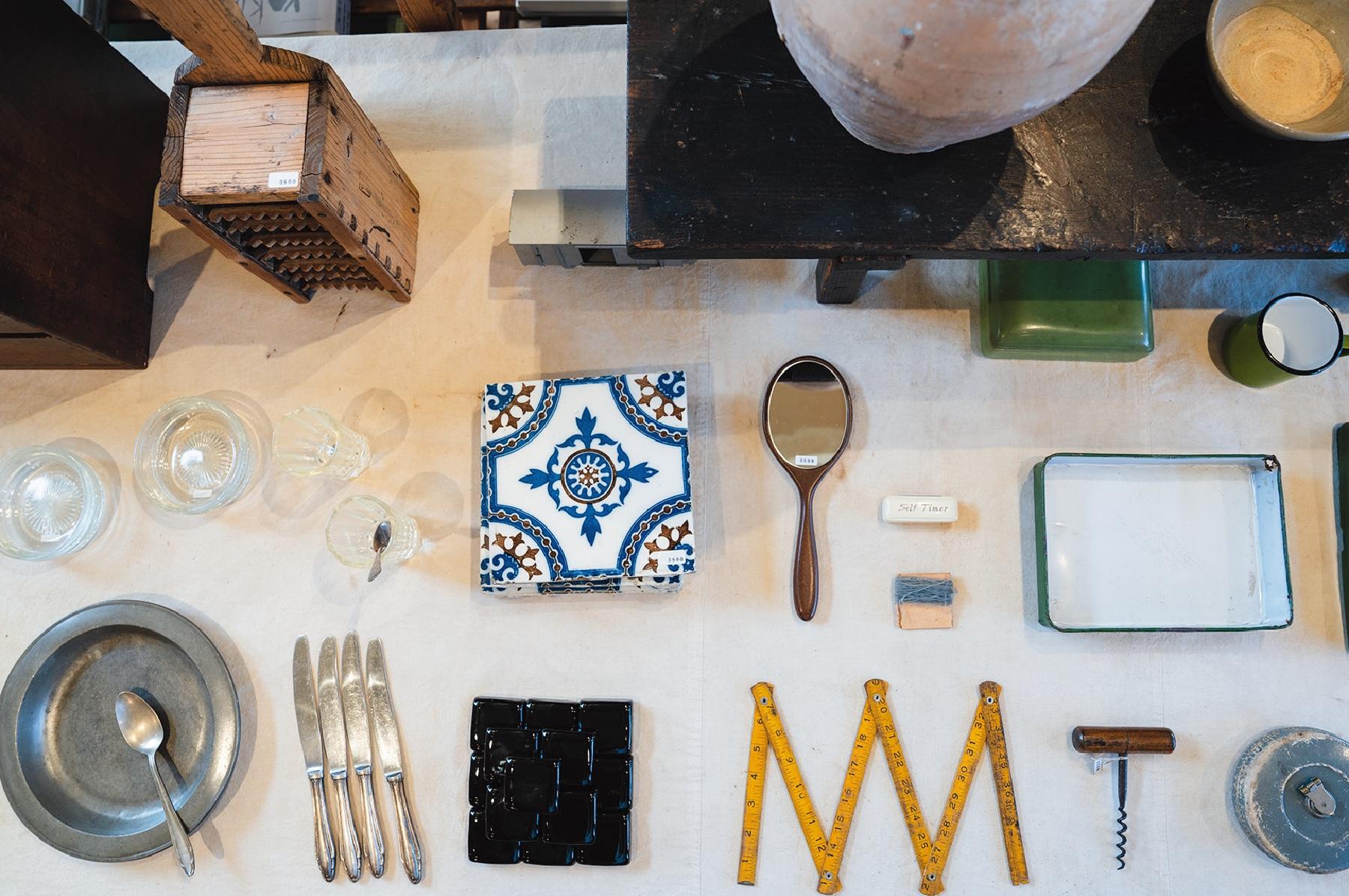 広い窓から自然光が降り注ぐ静謐な店内に、店主・君島北斗さんの目利きが光る古道具が計算された配置で並ぶ。「暮らしの中で使われていた道具の素朴さ、質素さの中に潜んでいる本来の美しさをセレクトの軸にしています」