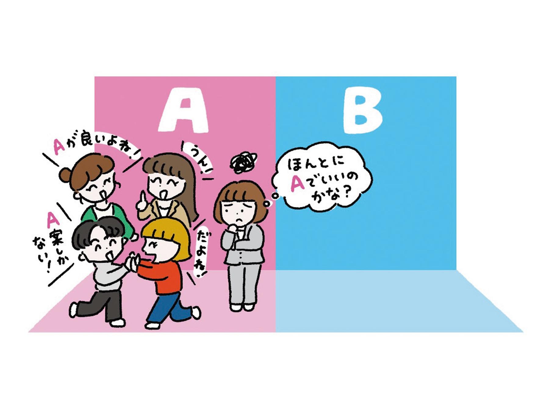 これまで話し合ってきた新企画のミーティング。2つのアイデアがあり,最初はみんな、どちらとも決めきれない様子だけど、全体としてはややA案に傾いてるかな。すると話し合いを進めるうちに、いつの間にか「A案しかない」と全員で大盛り上がり。あれ、けどこれでいいんだっけ?