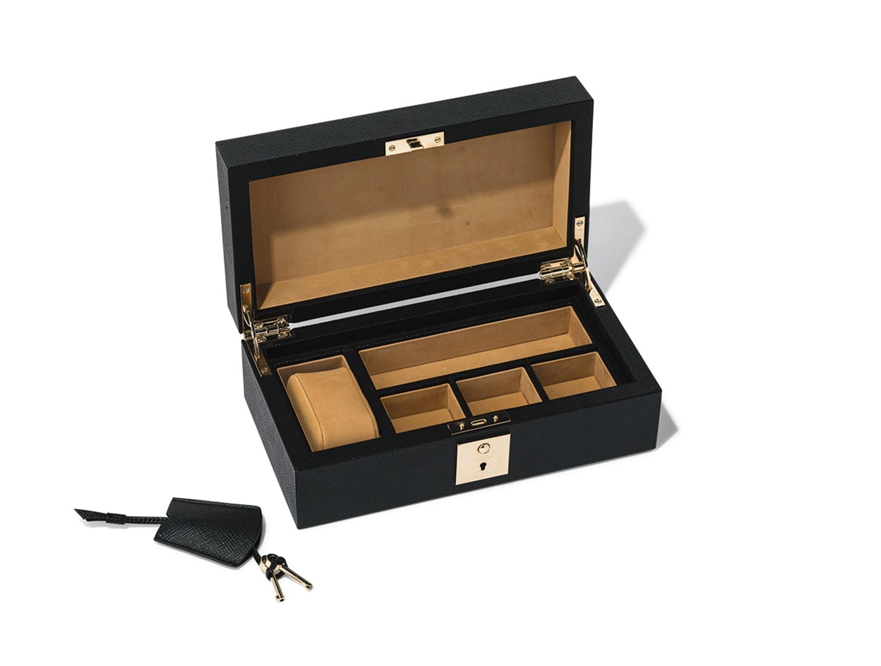 ブランドのアイコンともいえる、上質なパナマレザーを使った時計&カフリンクボックス。リングやピアスなど、ジュエリーを収納しても。W23.5×D12.5×H8.5cm ¥275,000(スマイソン/ルック 事業本部〈スマイソン〉 TEL. 03-6439-1675)