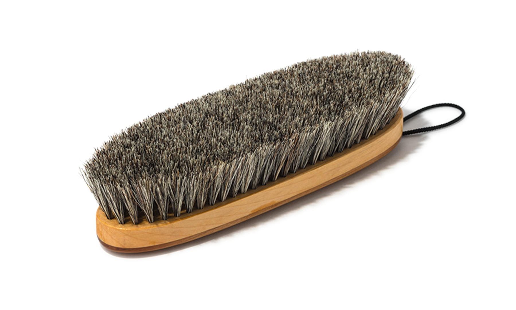 尾脇毛と呼ばれる、馬の尾の根元に生えているウブ毛を使用した洋服ブラシ。布地への当たりの柔らかさと埃を払うコシの強さ、相反する機能を満たした実力派で繊細なウールやカシミアの衣類のケアに最適。¥55,000(イシカワ TEL. 045-902-3824)