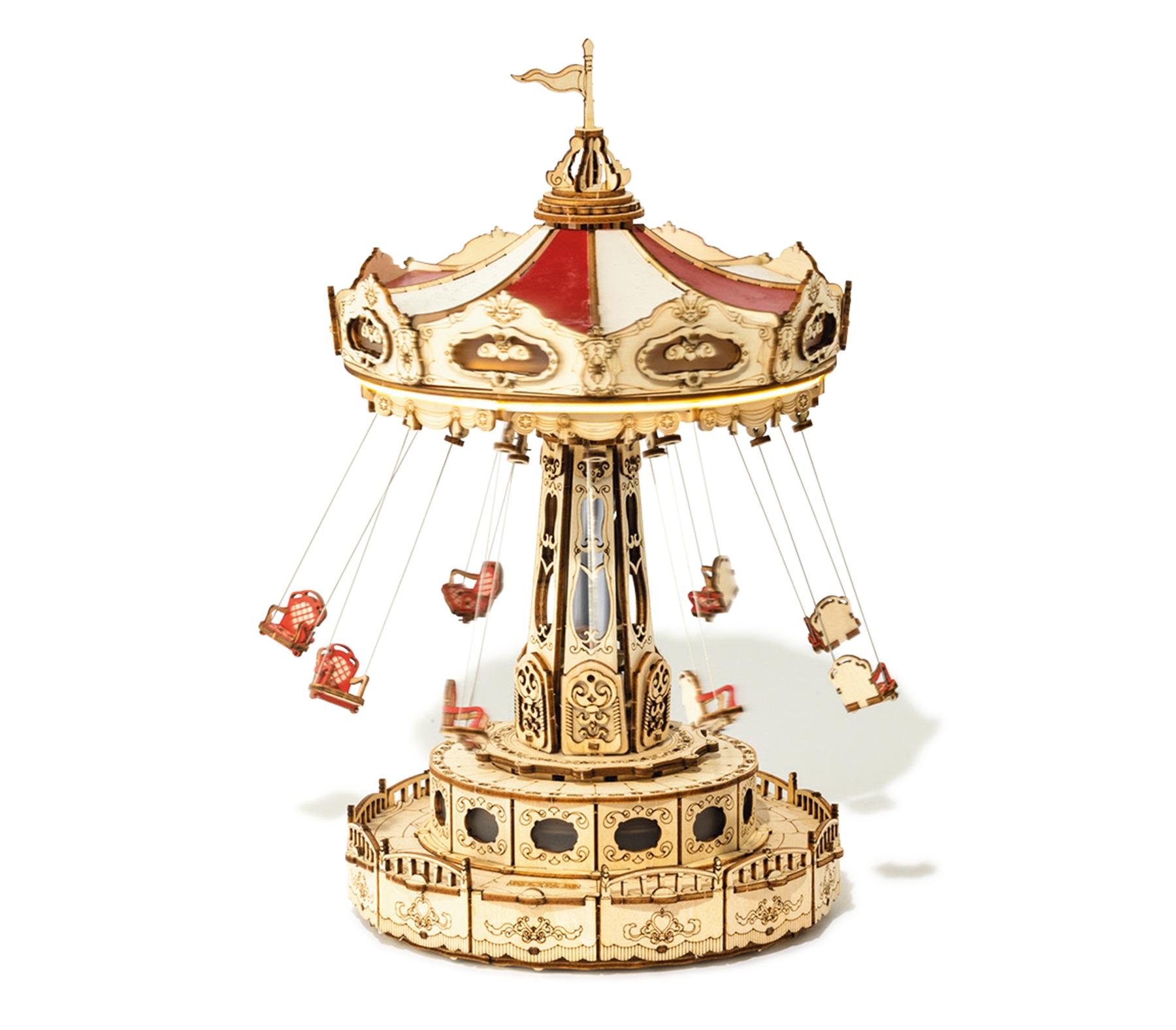 遊園地のスイングライドから着想を得た3Dパズル。ボタンを押すと、吊るされたシートが回転。音楽が鳴り、ライトも点灯するので、オルゴールや照明としても一役。約32×6×23cm¥6,600(MoMAデザインストア 表参道 TEL. 03-5468-5801)