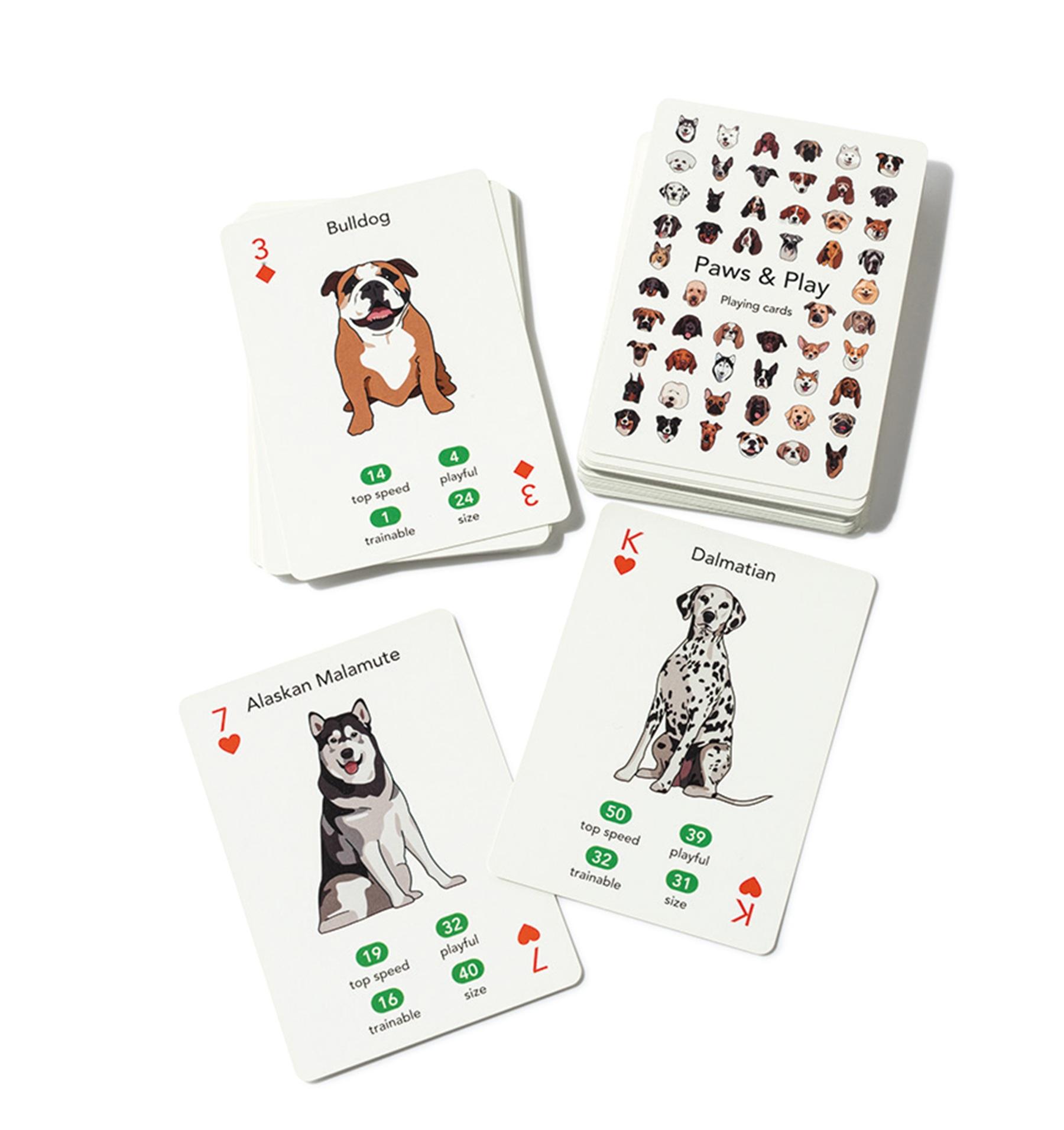 さまざまな犬が描かれたカードには、犬種ごとにやんちゃさやしつけやすさを数値化した記載もあり、通常のゲームの他、その数値で競うトップトランプも可能。¥2,200(キッカーランド/DETAIL ONLINE STORE)