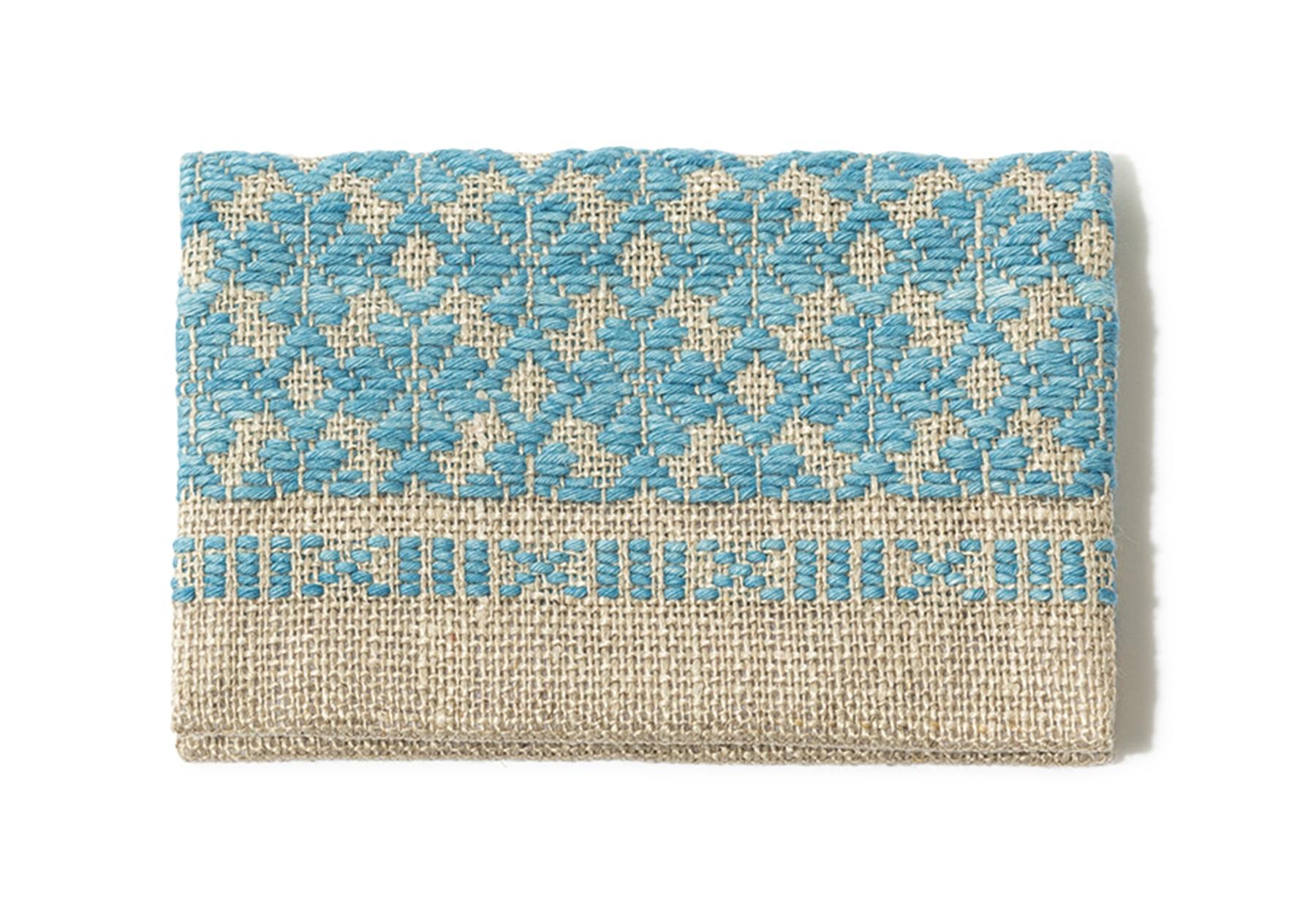麻布に糸で刺し子を施す青森の「津軽こぎん刺し」の技法で作られた、二つ折りタイプの名刺入れ。カードポケットが2つあり、収納力も十分。草木染特有の素朴で優しい色にホッとする。7.5×10.5cm ¥3,300(弘前こぎん研究所 TEL. 0172-32-0595)
