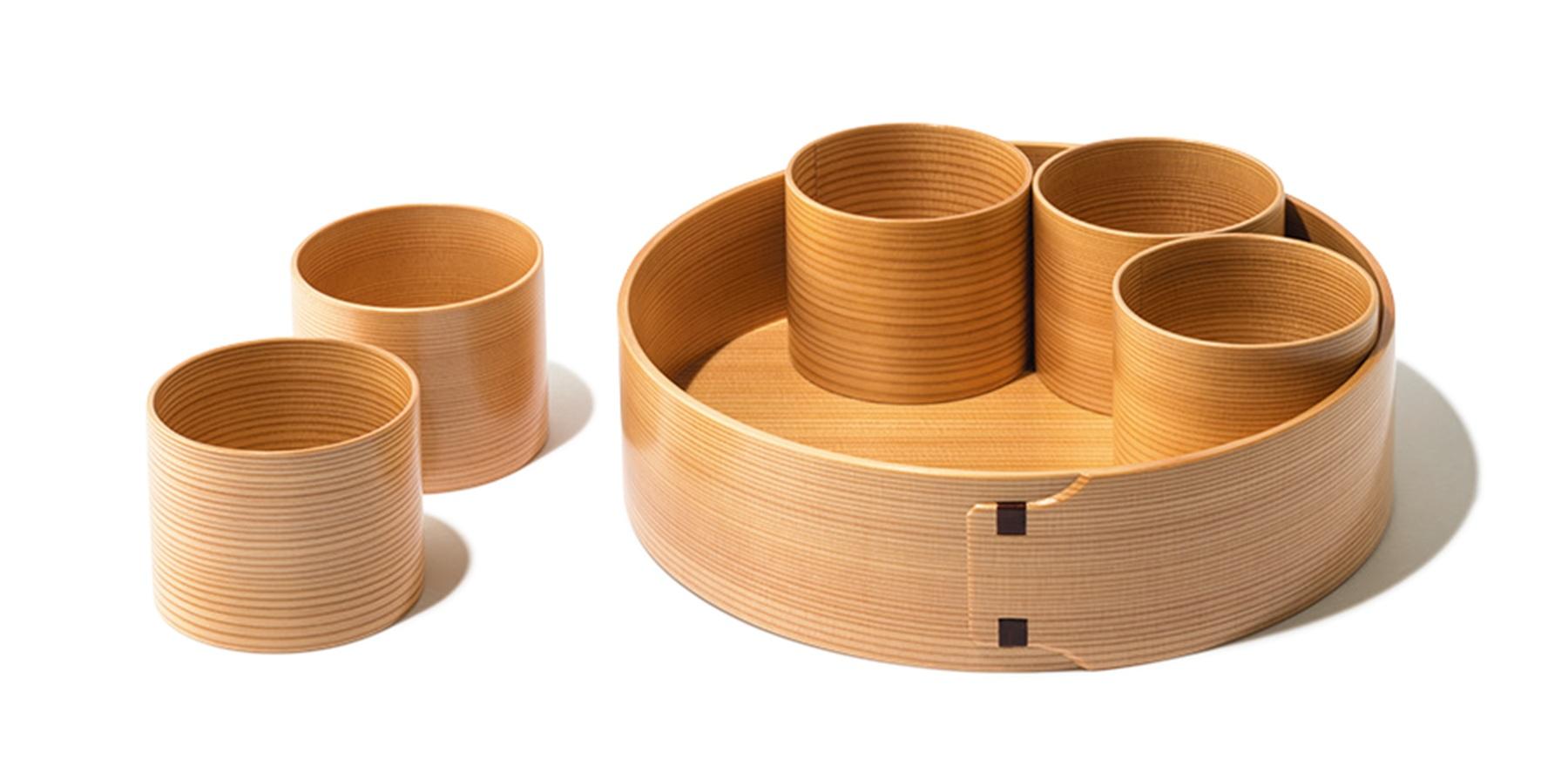 秋田県大館市の伝統工芸品である曲げわっぱの、そうめん鉢とそばちょこのセット。驚く軽さと、食欲をそそる秋田杉の香りが特徴の一つ。鉢には麺以外の食べ物を盛り付けてもOK。¥24,200(大館工芸社)