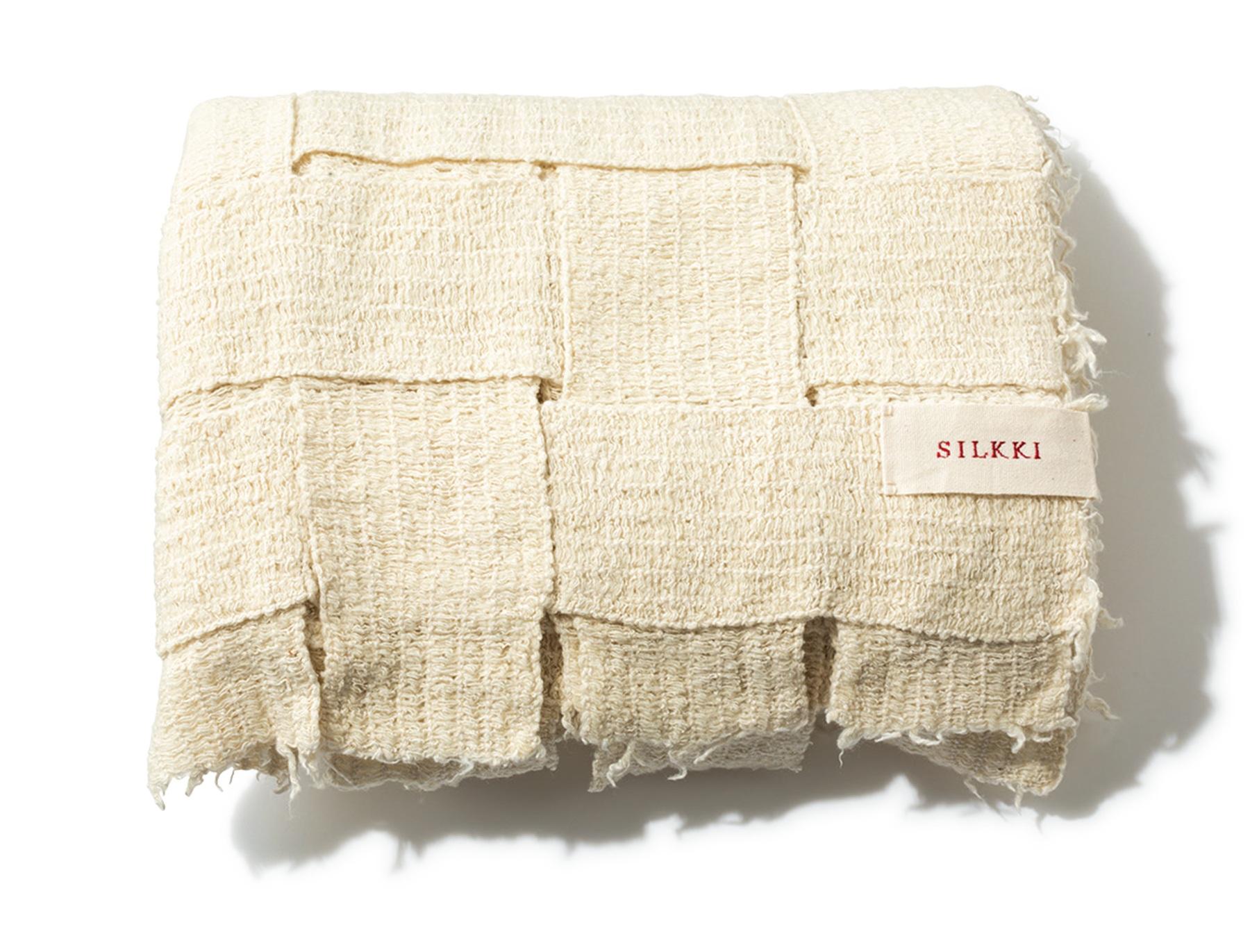 たっぷりのシルクとタスマニア島で生産された羊毛を、群馬県桐生の職人がていねいに編み上げた一枚。しっかりとした厚みがあって暖かいのはもちろん、軽いところもありがたいポイントに。58×170cm ¥24,200(SILKKI)