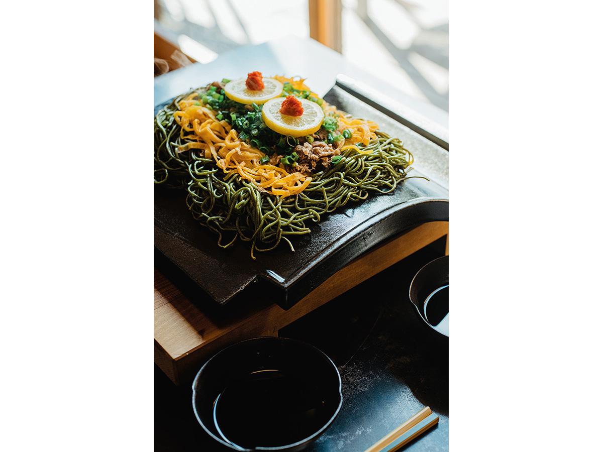 熱々の瓦で焼かれる香ばしい茶そばに舌鼓