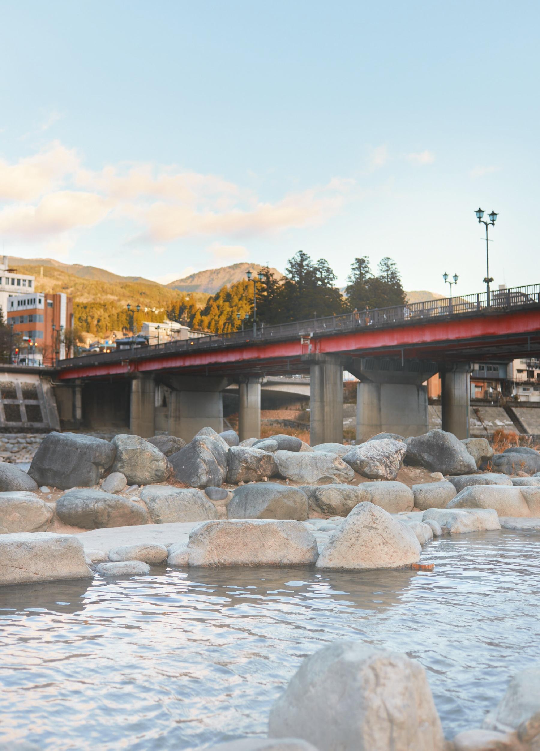 1983年に無料で入れる露天風呂として設置された噴泉池。今は足湯専用になり、早朝の清掃時間(7~8時)以外はいつも開放中。縦6.5m、横5mで、周りを囲う石に10人以上は座れるくらいの大きさ。温泉が流れ出る上流の温度は熱めだから、冷え切った足元を温めていくのにぴったり。3月28日までの毎週土曜は、20:30からの約10分間、飛騨川付近で花火が打ち上がる予定。