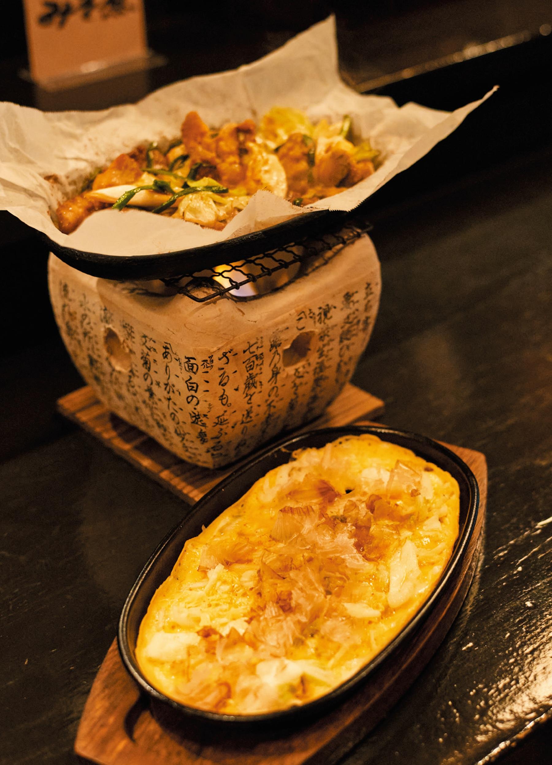郷土料理であり、地元民にとっては家庭料理的な存在でもある鶏ちゃんと漬物ステーキを食べるなら、どこかほっとする空気感のある居酒屋『祭ばやし』がおすすめ。店主の熊崎淳二さんが腕を振るう鶏ちゃんは、八丁味噌と白味噌を混ぜて作るオリジナルの味噌ダレが特徴。ニンニク少なめだから、初めて食べる人にも優しいお味。七輪で炙りながら、卵黄を絡めていただこう。地元で採れた濃厚な卵を使い、白菜の浅漬けと絡めてふわふわに仕上げるつけものステーキは人気の王道メニュー。