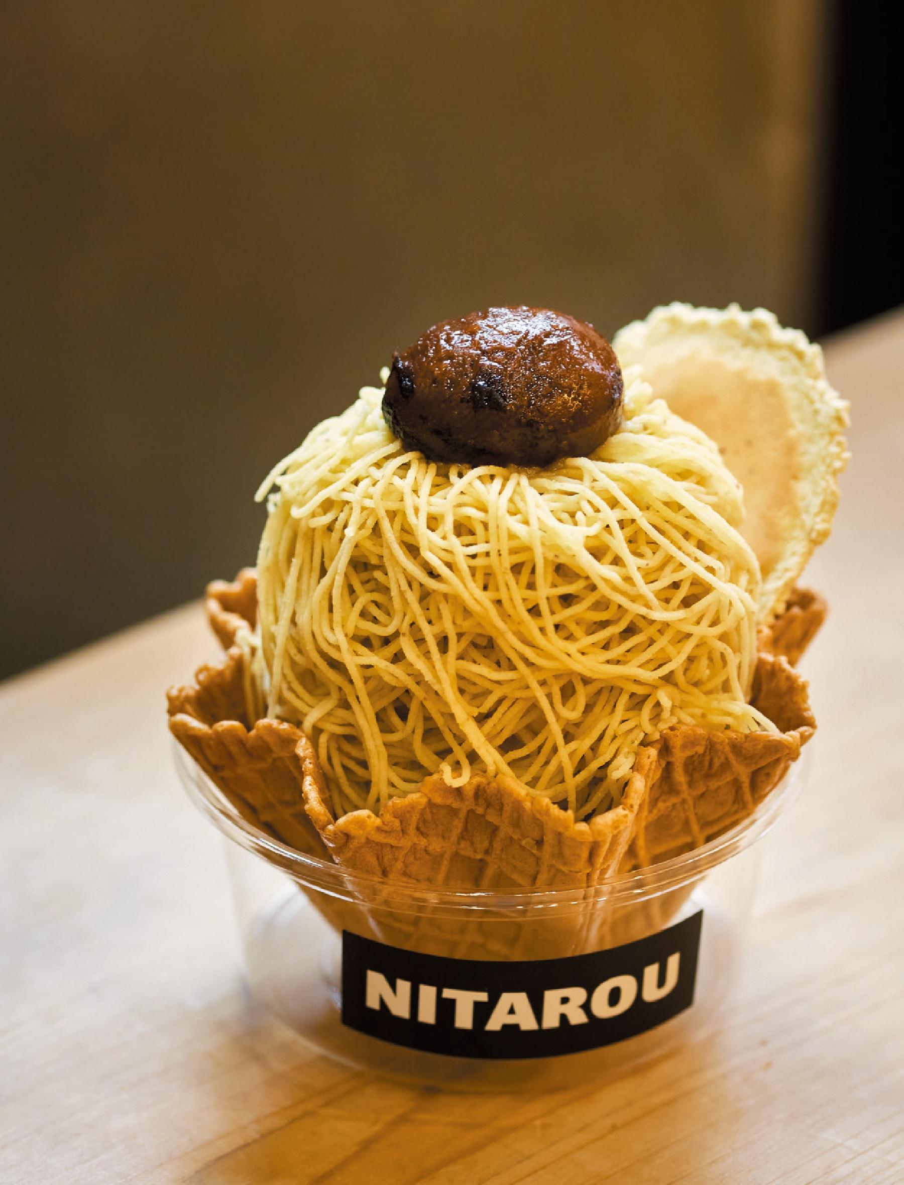 使用する栗きんとんは栗100%。モンブランペーストは錦糸のような極細に仕上げ、なめらかな口溶けを追求。添えられた煎餅は栗きんとんを香ばしく焼き上げたもの。栗まるけ ¥1,000。