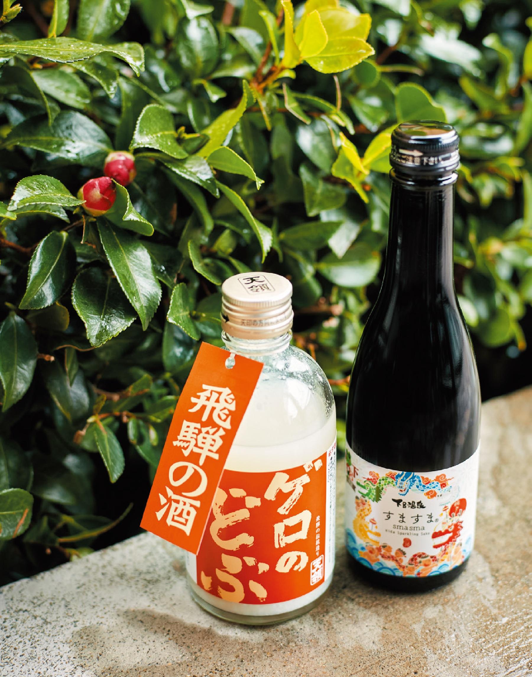 米の旨みが優しく広がるどぶろく「ゲロのどぶ」260ml ¥668と、甘口のスパークリング日本酒「すますま」250ml ¥703。どちらも「天領酒造」自慢の一本。