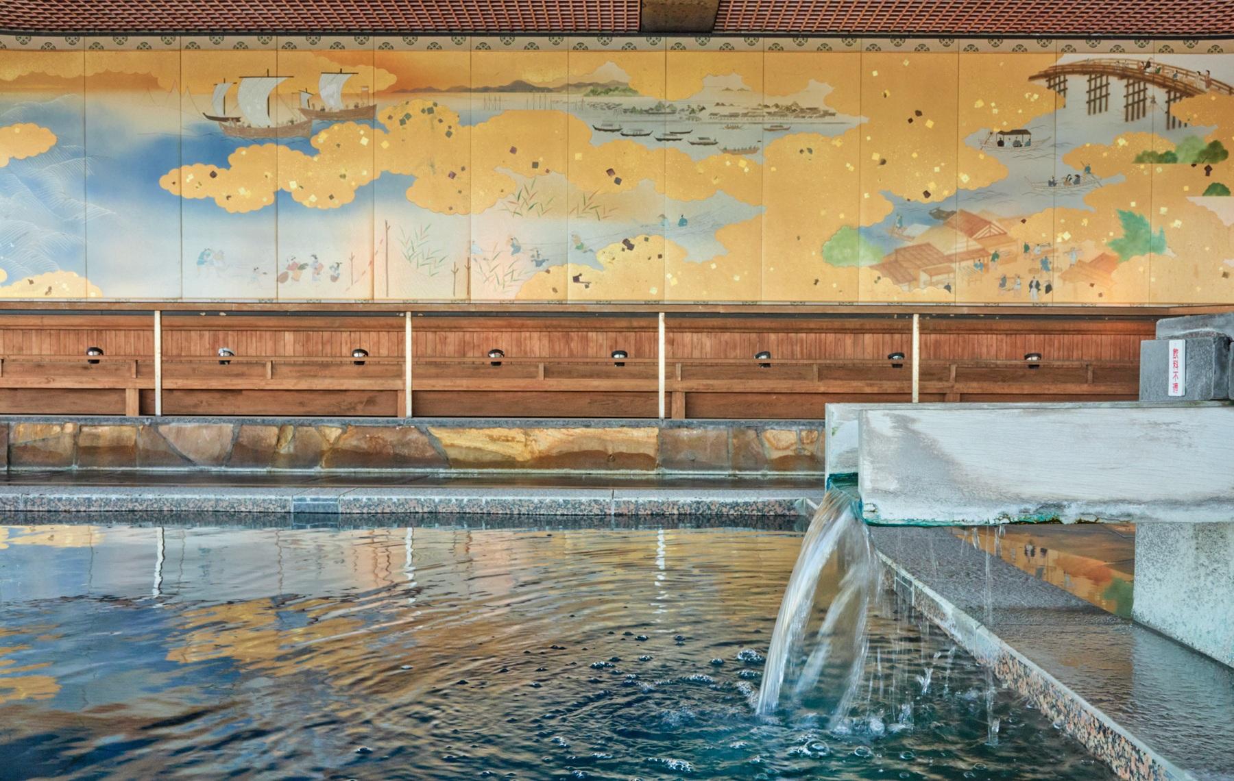 「富士の湯」の外湯。絵巻物を思わせる美しい壁画に目を奪われる。