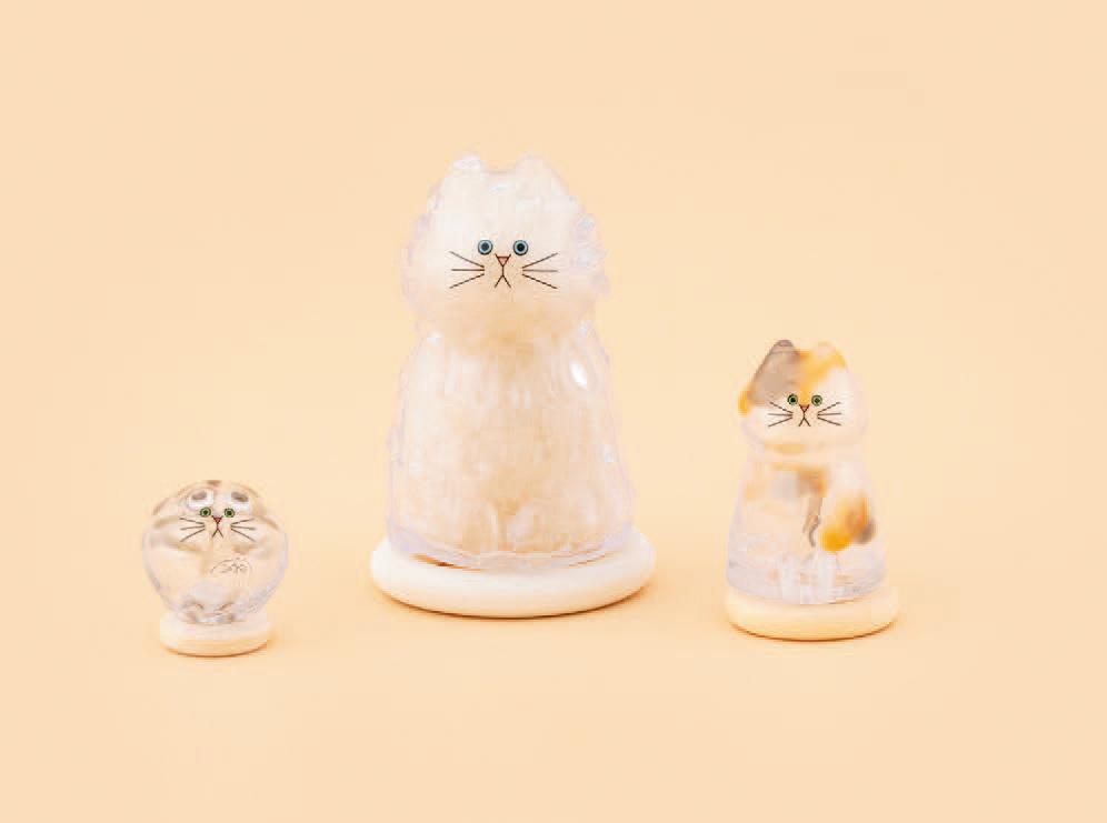 とぼけた表情がかわいい、猫の毛を入れる樹脂製の入れ物。不定期で販売されるオーダーでは、愛猫の色や柄をイメージして入れ物を製作してくれる。サイズはS、M、Lの3種類。S ¥3,630~L ¥5,280(けだま工房)