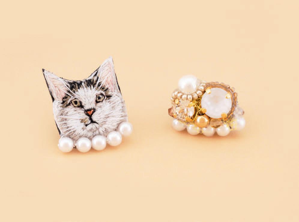 小さなパールラインが上品な、手刺繍の猫モチーフのピアスが愛猫でオーダー可能。もう一方はスワロフスキーストーンがアクセントのビジューで、アシンメトリーなデザインに。イヤリングでも製作可能。¥7,700(micoh)